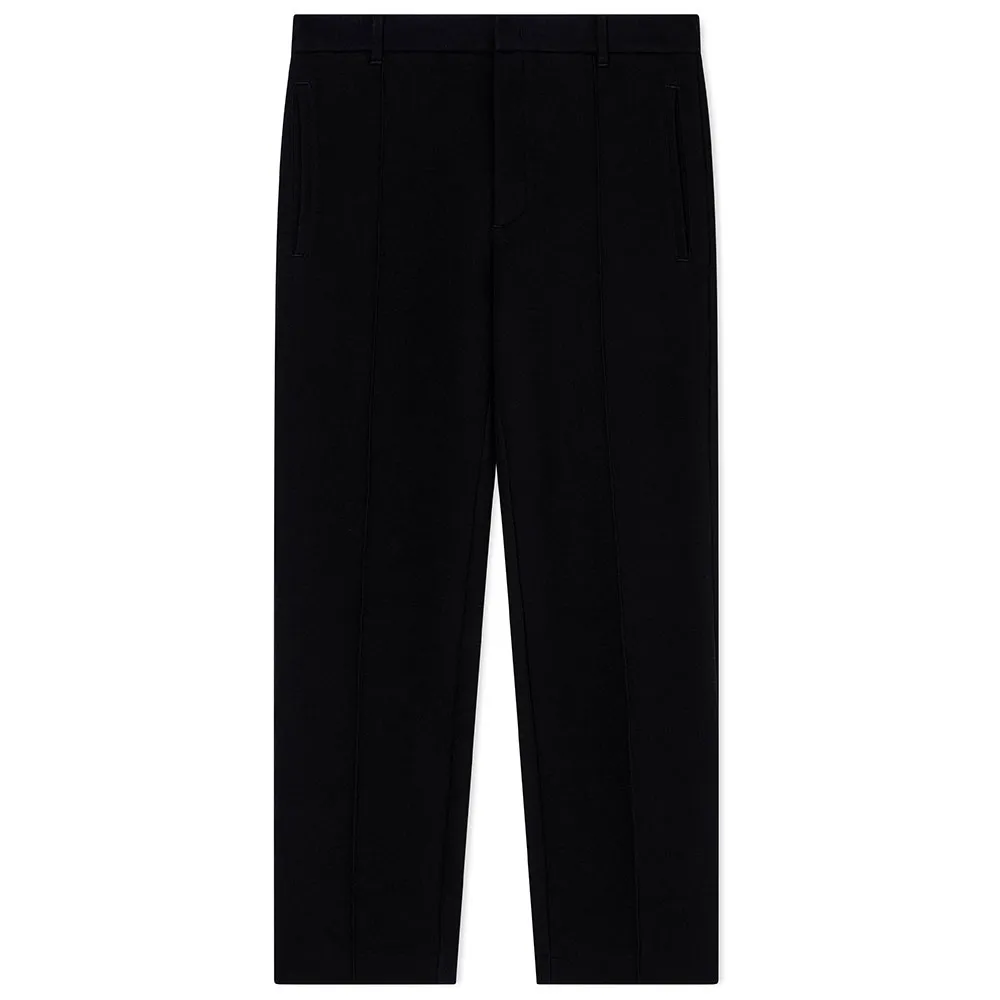 Брюки-чинос, застежка на невидимый крючок, шлевки для ремня, центральные ребра, прямые штанины и металлическая пластина с логотипом на спине.