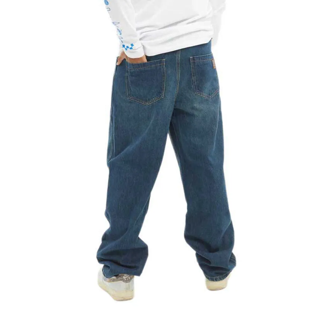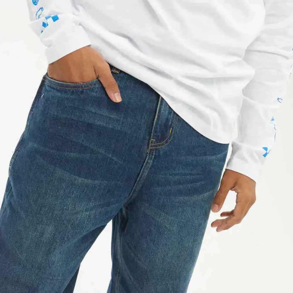 Джинсы с 5 карманами / Свободный крой / Низкая талия / Ширина штанин 15 для размера 32 / Утяжки и усиление тройной строчкой в местах, наиболее подверженных износу из-за катания на скейтборде и лонгбординге.