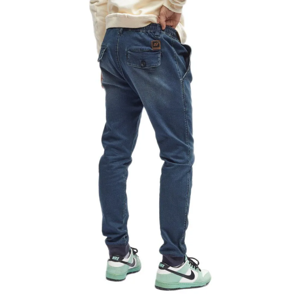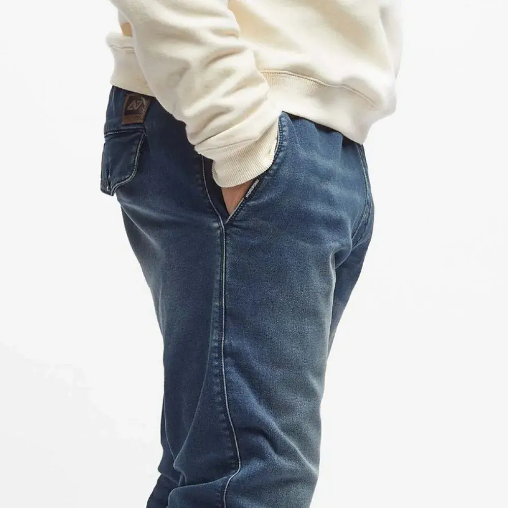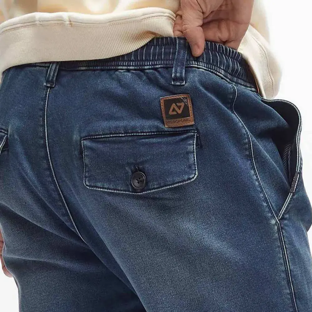 - Сверхэластичная и адаптивная ткань, сочетающая классический вид денима и комфорт брюк для бега.