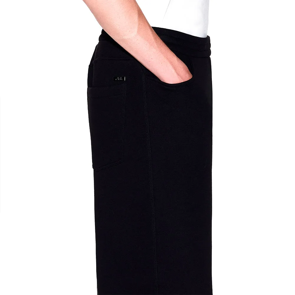 Спортивные брюки с эластичным поясом, прорезными карманами, прямыми штанинами, накладными карманами и металлической табличкой с логотипом на спине.