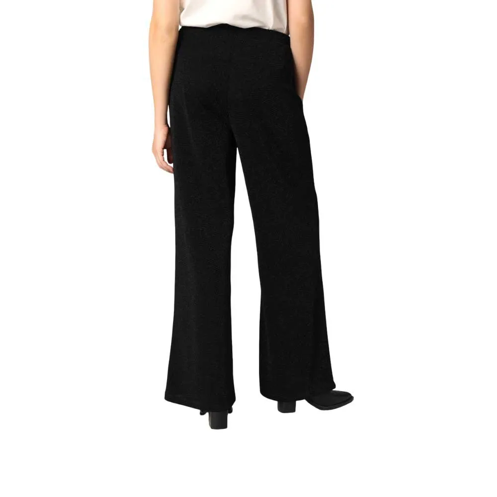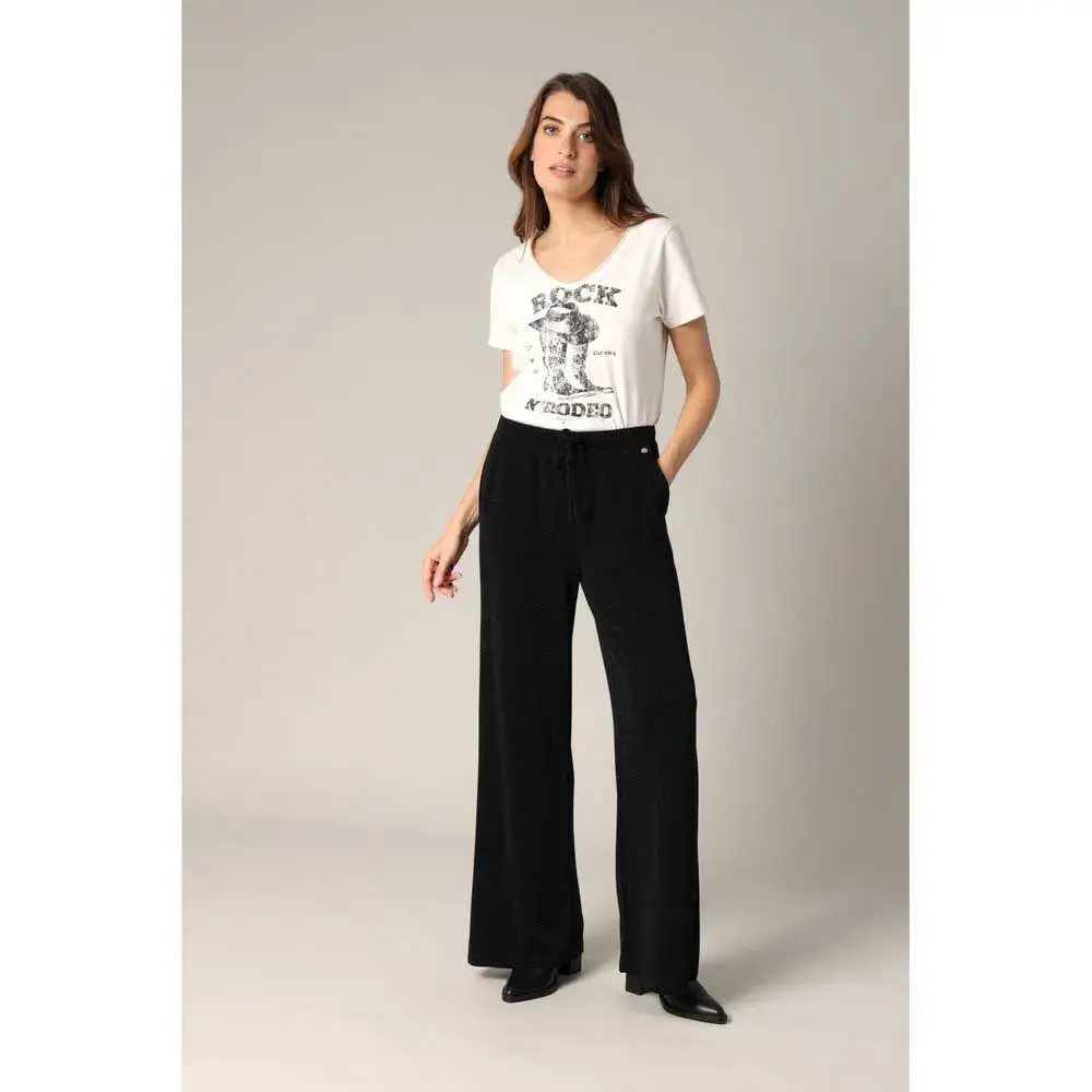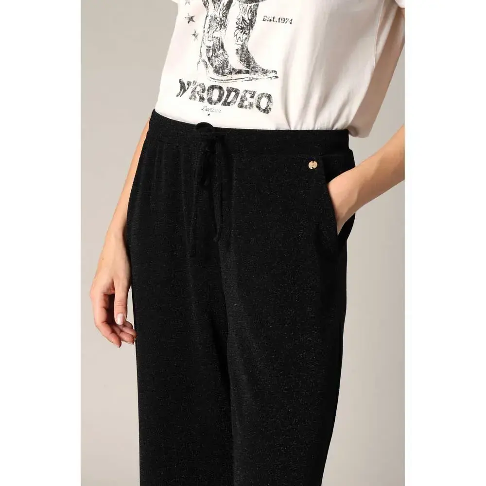 Эти брюки свободного кроя завораживают своей слегка переливающейся черной тканью, которая идеально подходит для того, чтобы украсить ваш наряд, не переусердствовав с ним. Их широкий крой обеспечивает красивую плавность, а эластичный пояс идеально облегает фигуру благодаря завязке тон в тон. Мы ценим наличие двух практичных карманов и неброской металлической медали, прикрепленной к одному из них. Универсальные, они одинаково хорошо сочетаются как с повседневным образом с футболкой с принтом, так и с более изысканным нарядом с атласной блузкой. Удобная, привлекательная модель, которая решительно идет в ногу со временем.