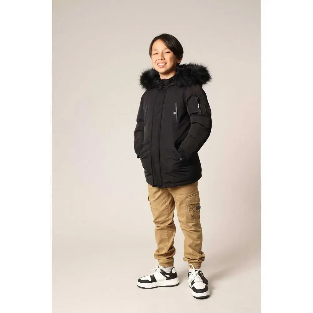 Sharkson - идеальная парка для встречи зимы со стилем и защитой. Теплая и практичная, она имеет удобный прямой крой и застежку-молнию, скрытую под планкой с кнопками. Высокий воротник украшен съемным черным искусственным мехом, создающим модный и адаптируемый вид. Спереди есть практичные карманы, карман на молнии на рукаве и внутренний карман для хранения предметов первой необходимости. Ребристые манжеты обеспечивают хорошую теплоизоляцию. Зимний гардероб, необходимый для юных городских искателей приключений.