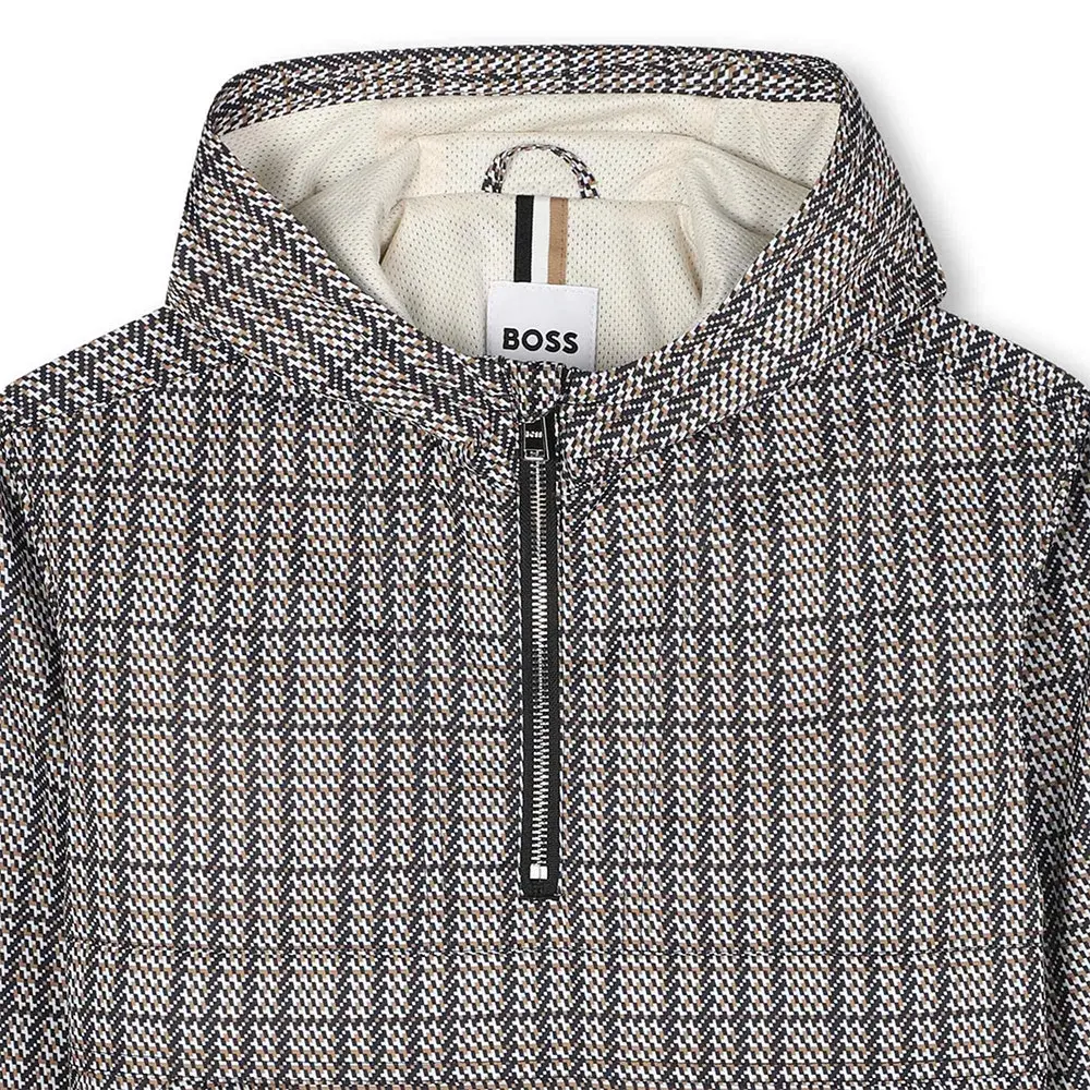 Ветровка с капюшоном и наполовину застежкой-молнией из 100% полиэстера с культовым принтом по всему телу, разрез спереди, боковые карманы, силиконовый значок двойной буквы B.