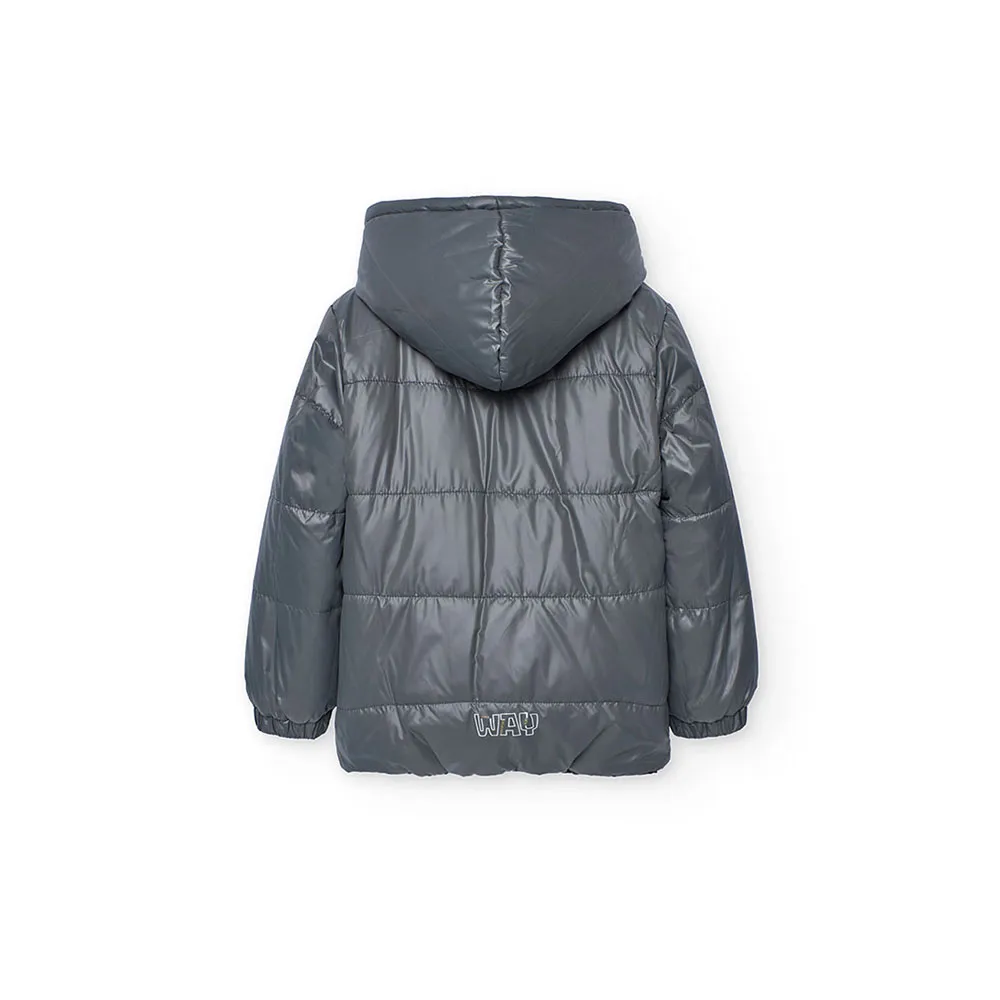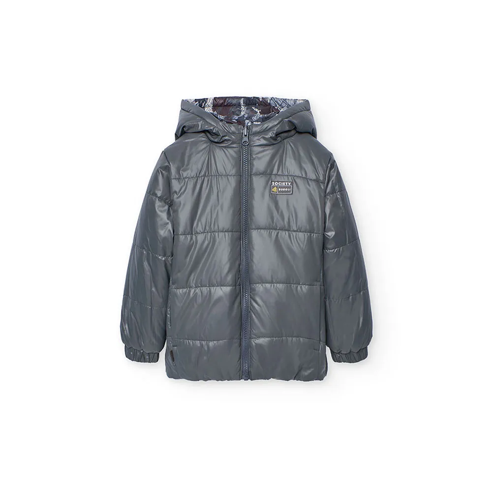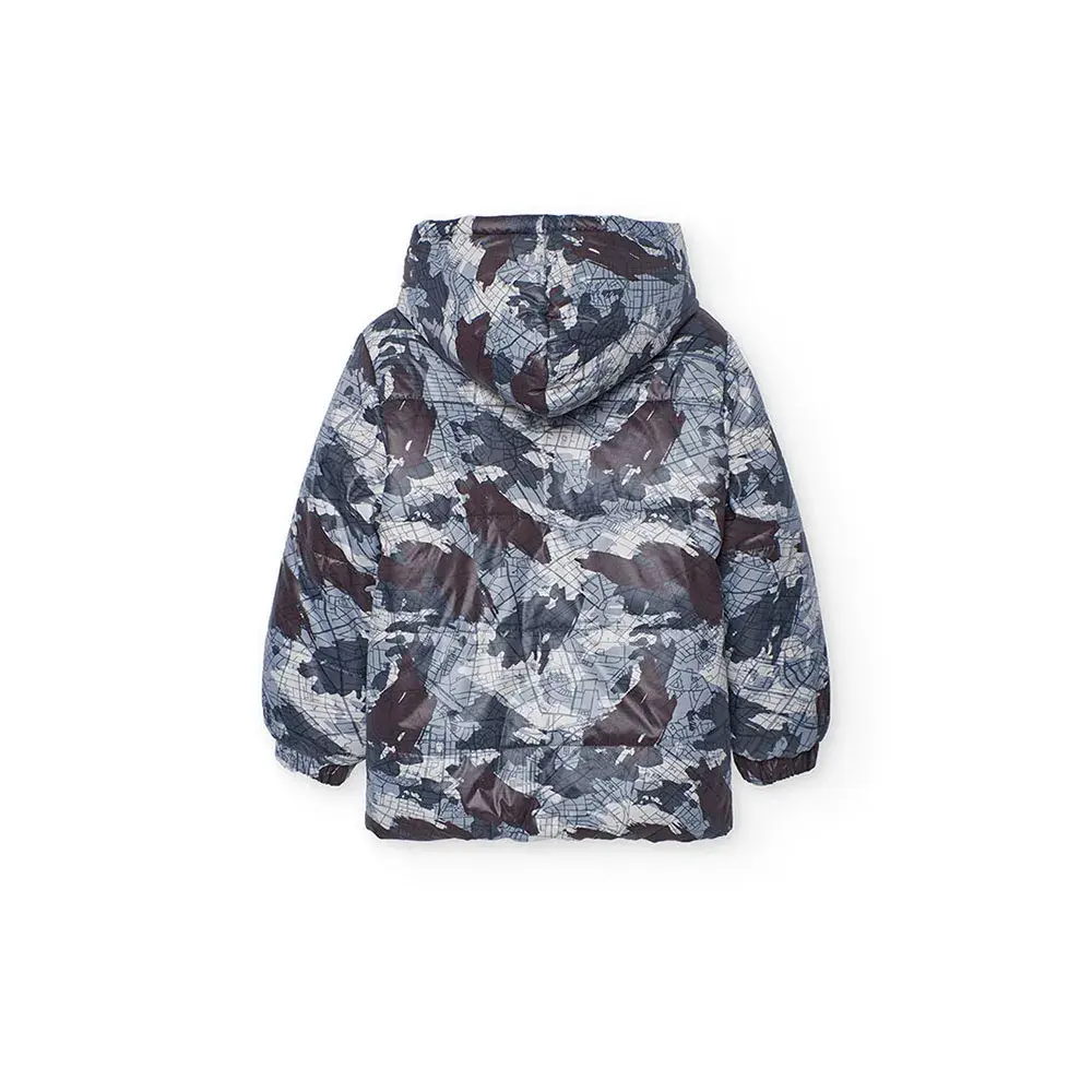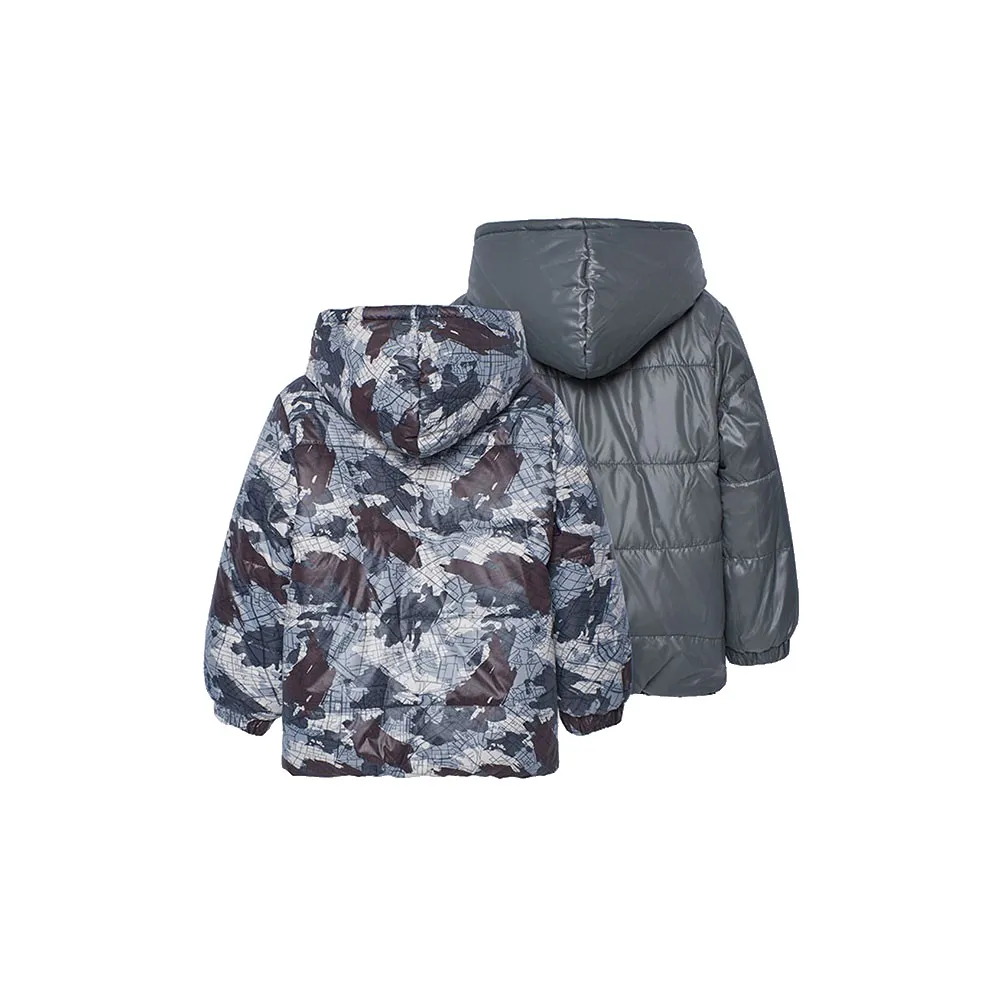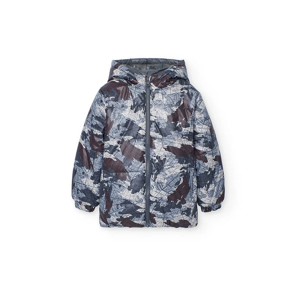 Двусторонняя техническая парка для мальчиков с элегантным абстрактным принтом в серых тонах, идеально подходящая для зимнего сезона.