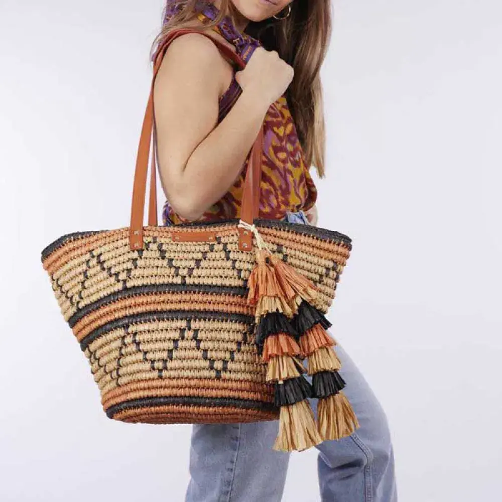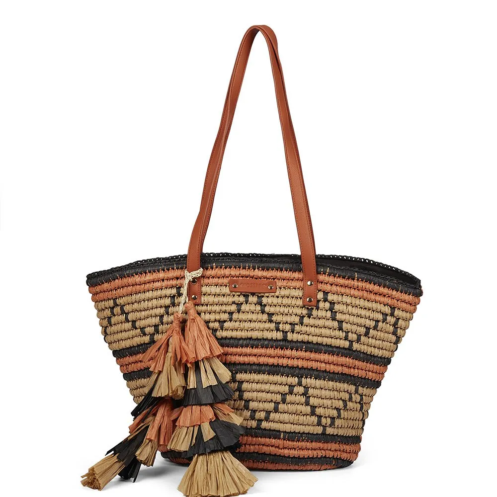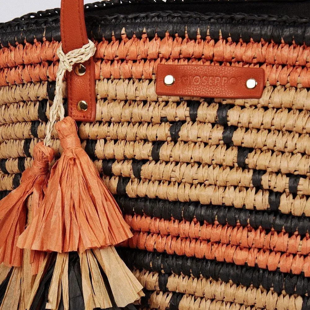 Наслаждайтесь новой коллекцией сумок gioseppo accessories ss23 из рафии прямо сейчас! разноцветная сумка-тоут из рафии с ручками и подвесным декором из рафии.