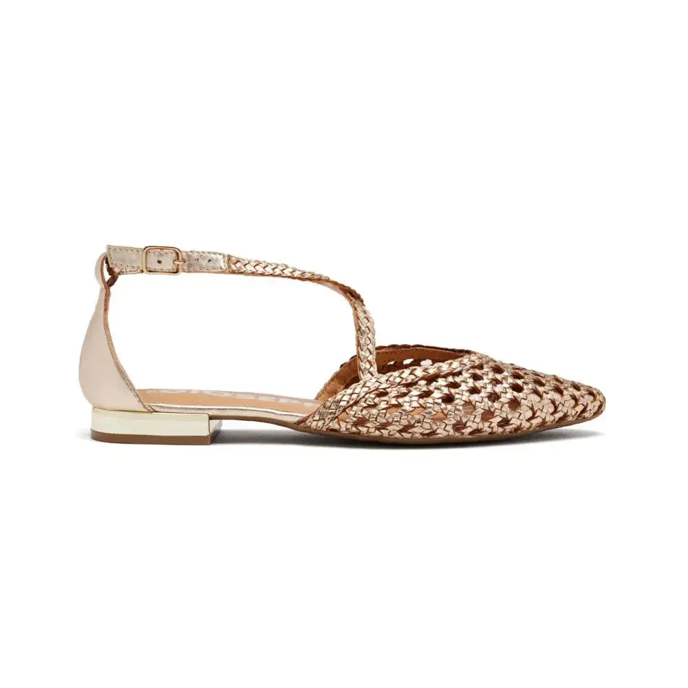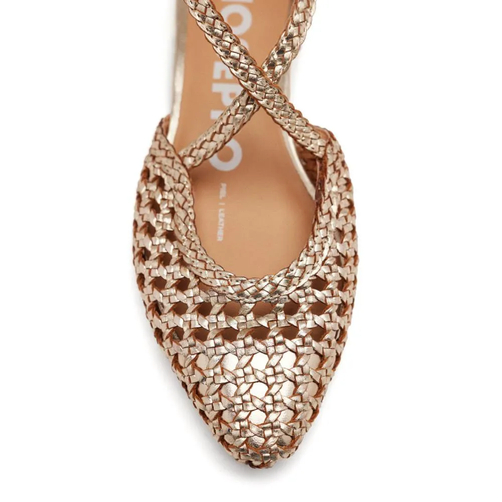 Одна из обязательных вещей сезона, которую вы не можете пропустить! Кожаные балетки платинового цвета с тонким носком, плетеной кожей и деталями из тесьмы на подъеме.