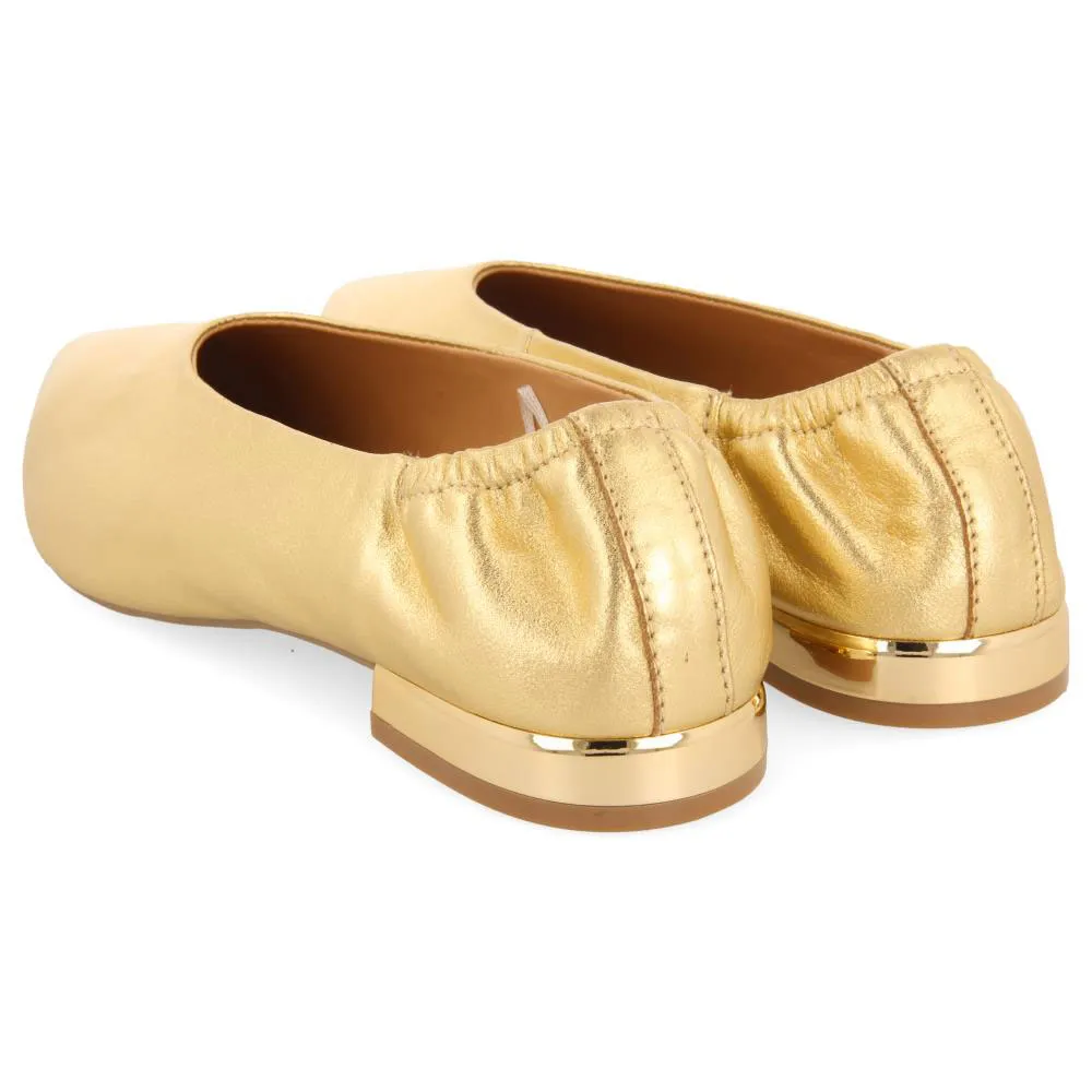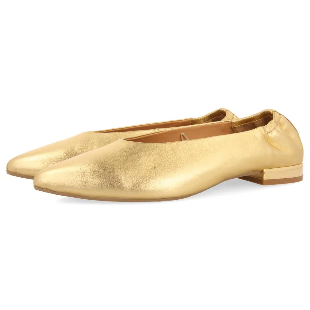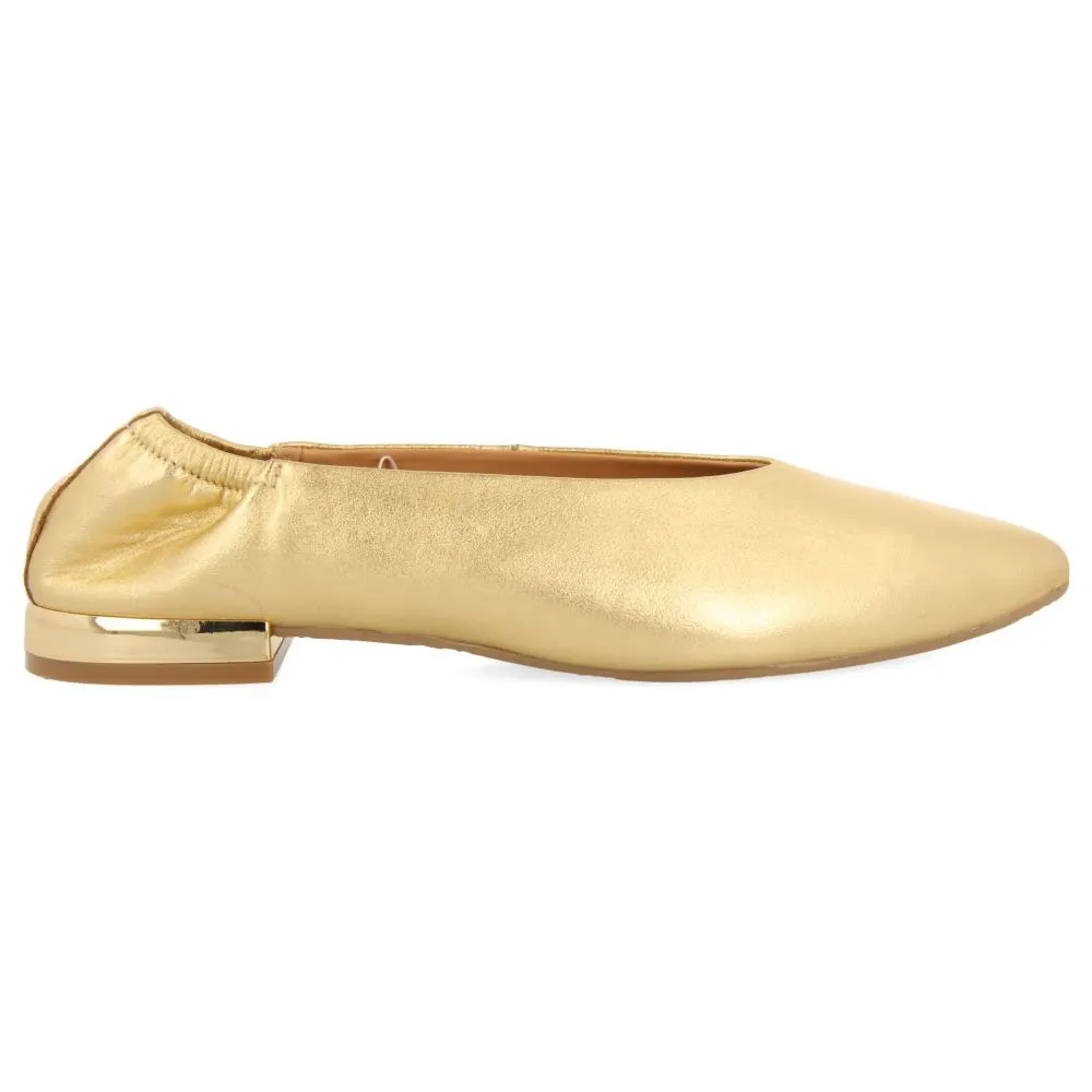 Балетки из золотистой кожи с изящным носком и присборенной деталью на каблуке.