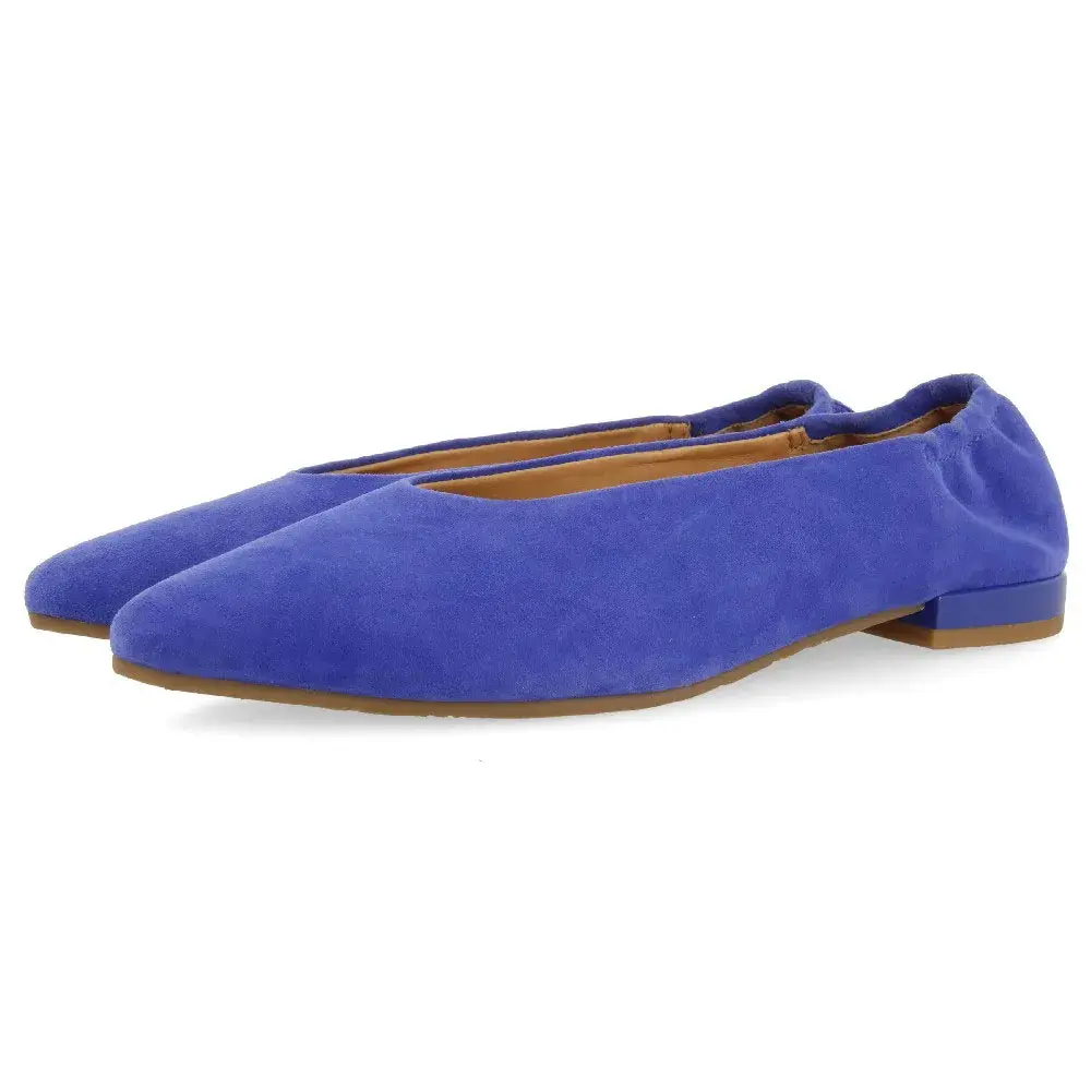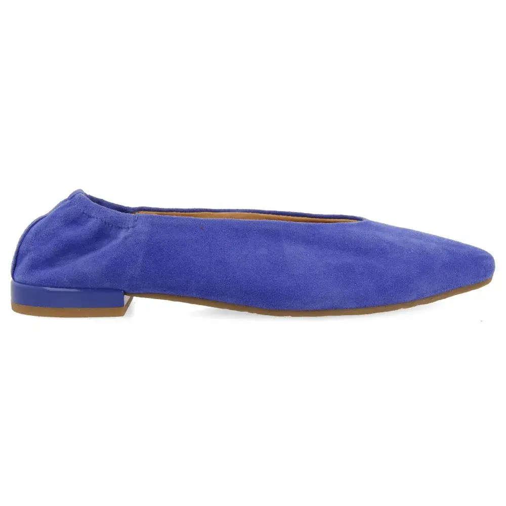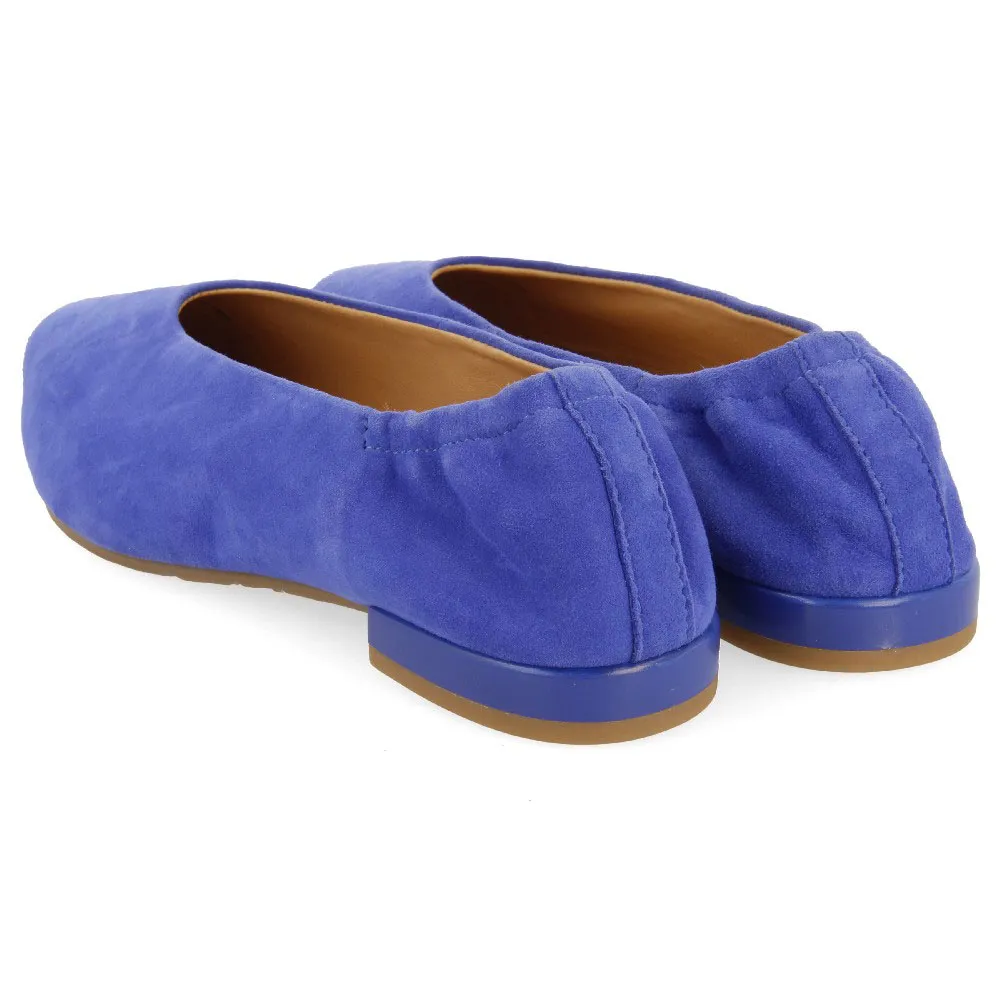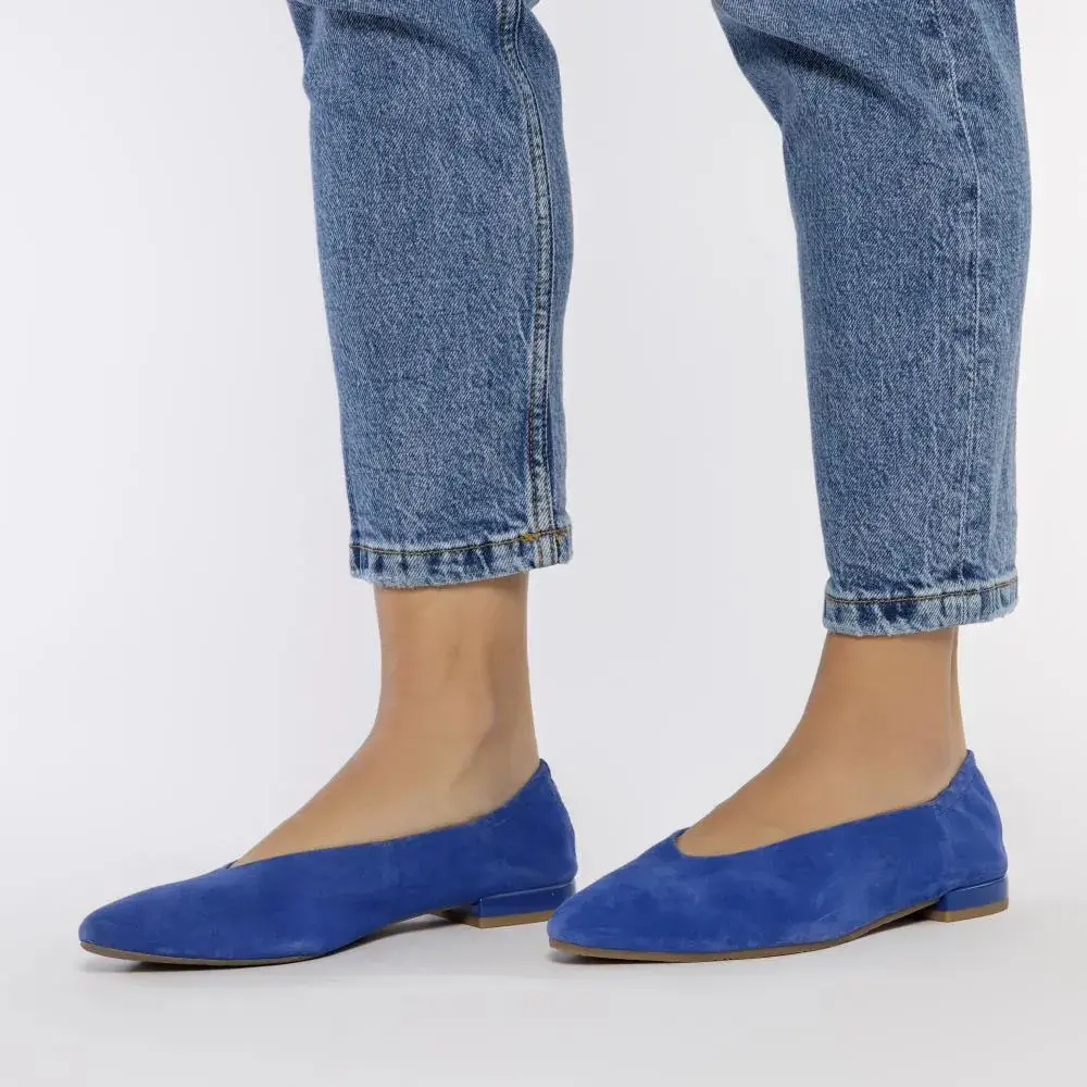 Синие замшевые балетки с изящным носком и присборенной деталью на пятке.