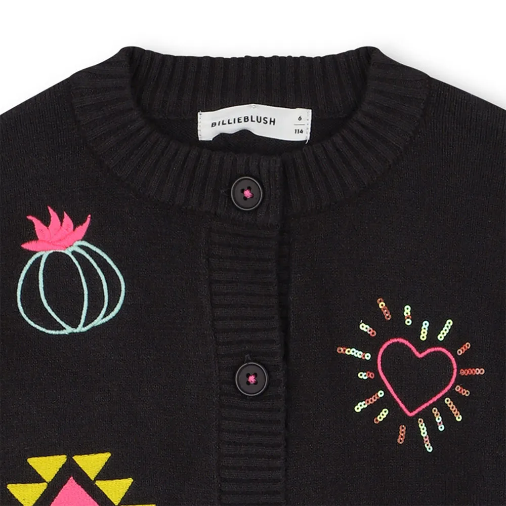 Шикарный и сверкающий вязаный кардиган, застежка спереди на пуговицы, несколько ярких вышивок, этикетка.