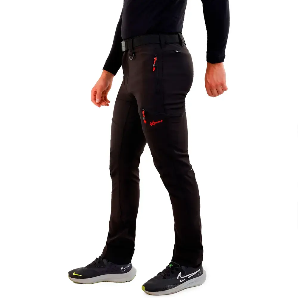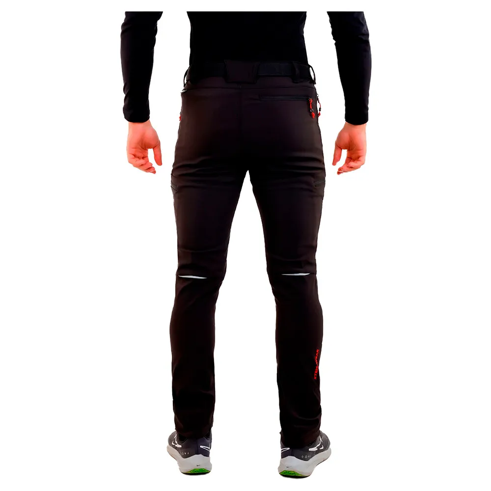 Полуэластичная талия с застежкой на кнопки и регулируемым эластичным поясом, пять карманов с обратными молниями, усиление шагового шва, вытачки на коленях, светоотражающая окантовка сзади, специальная ткань и регулируемая резинка внизу, вышитый логотип.