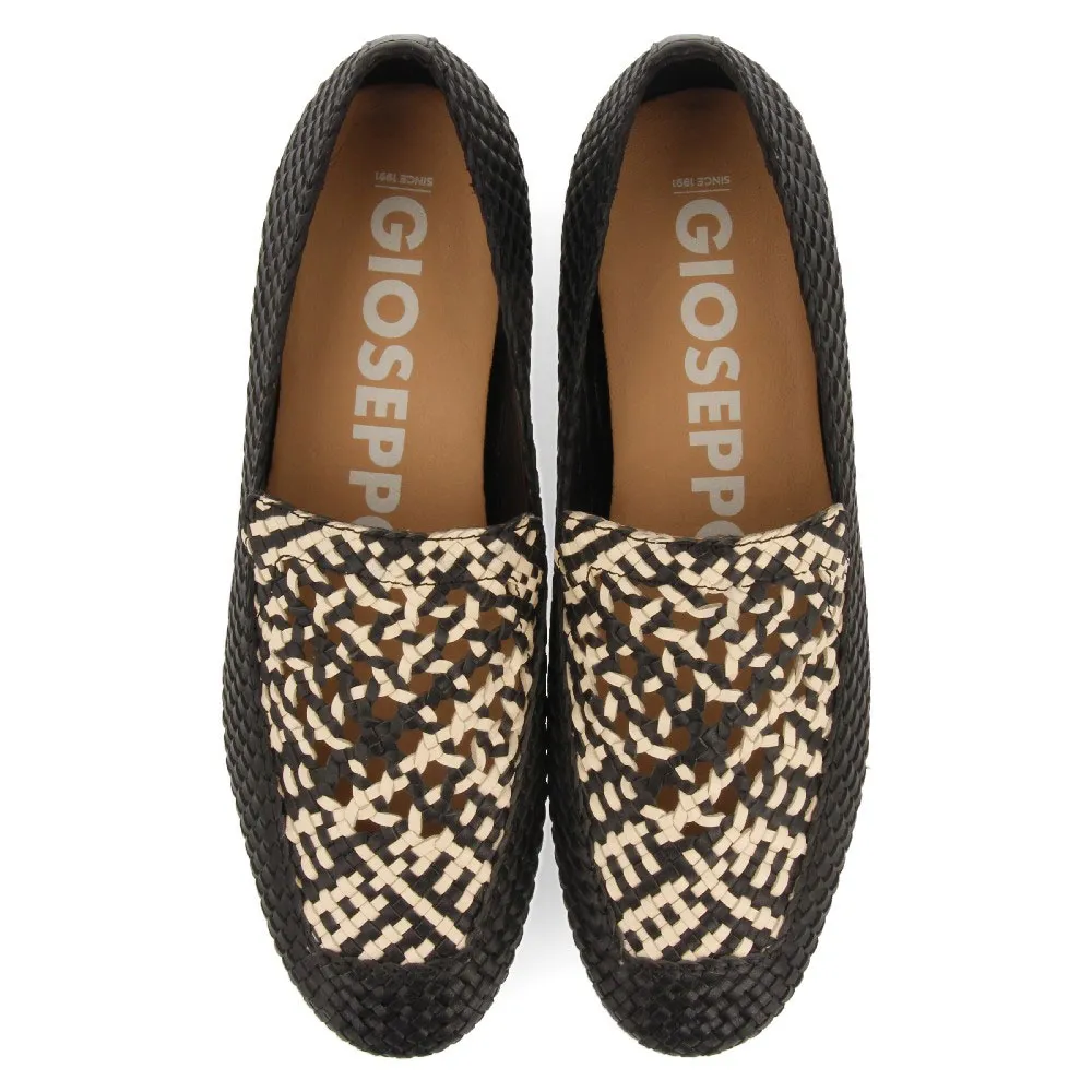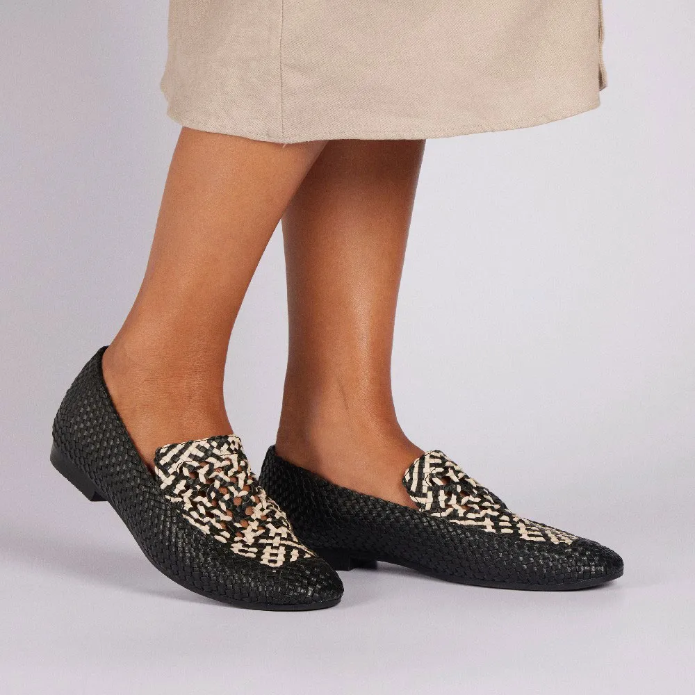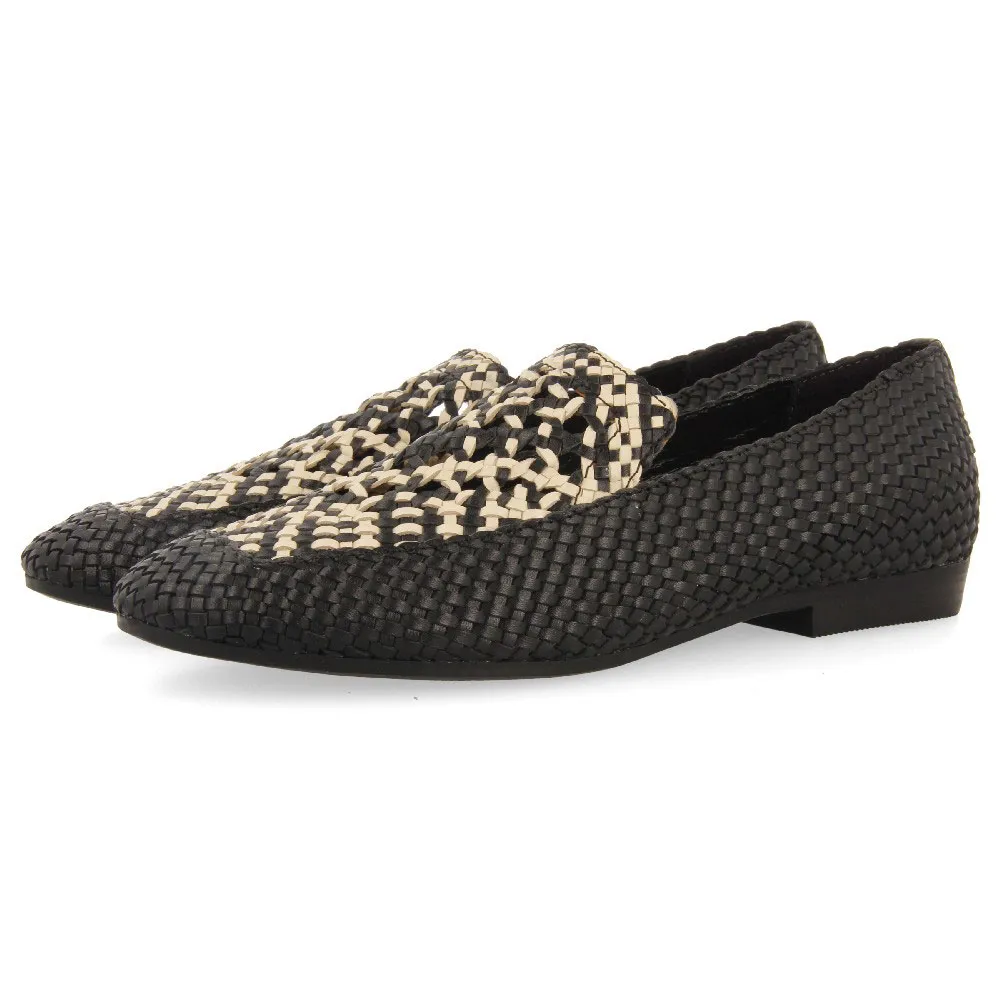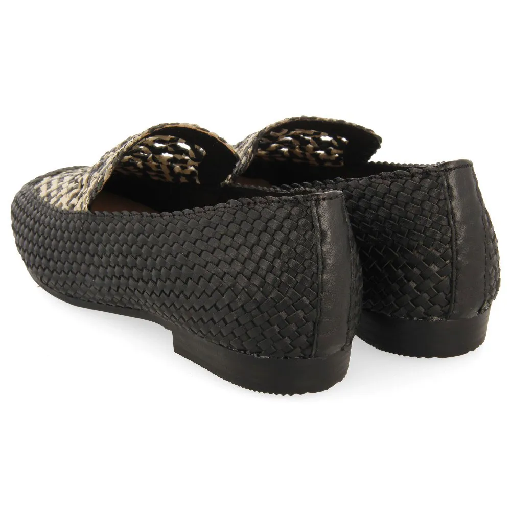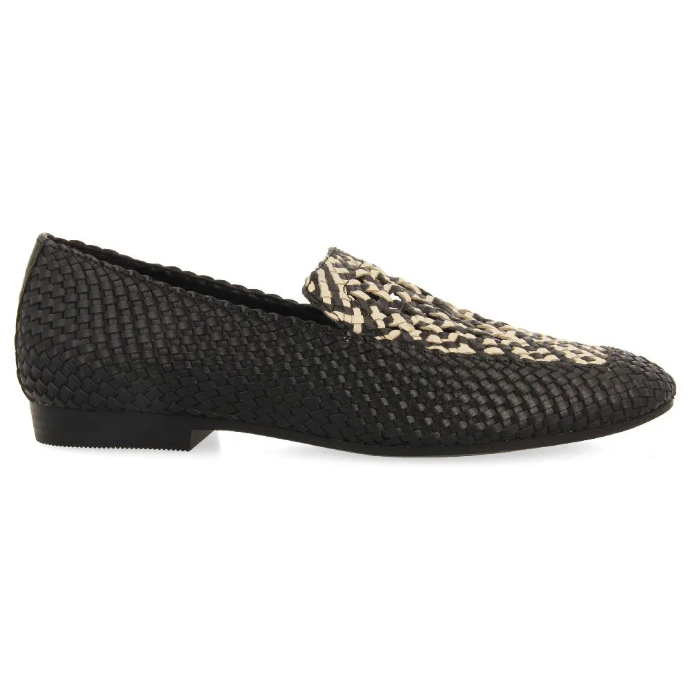 Мокасины из черной плетеной кожи с двухцветными деталями на подъеме.