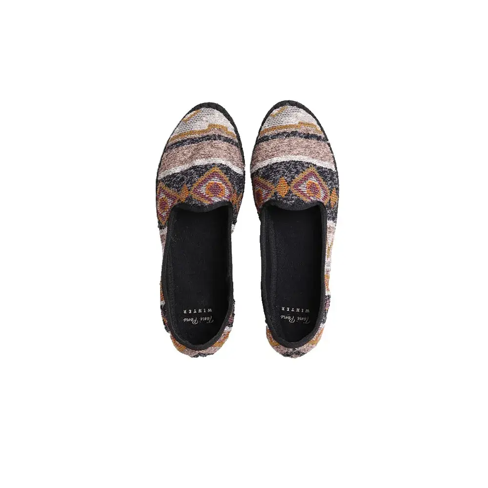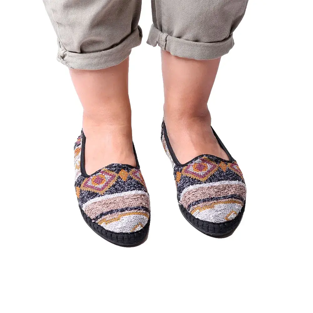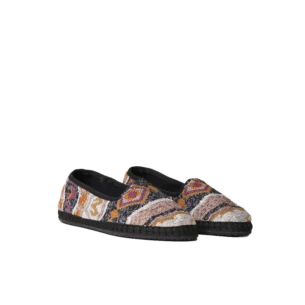 Эти женские балетки на плоской подошве выполнены из набивной ткани с контрастной отделкой.