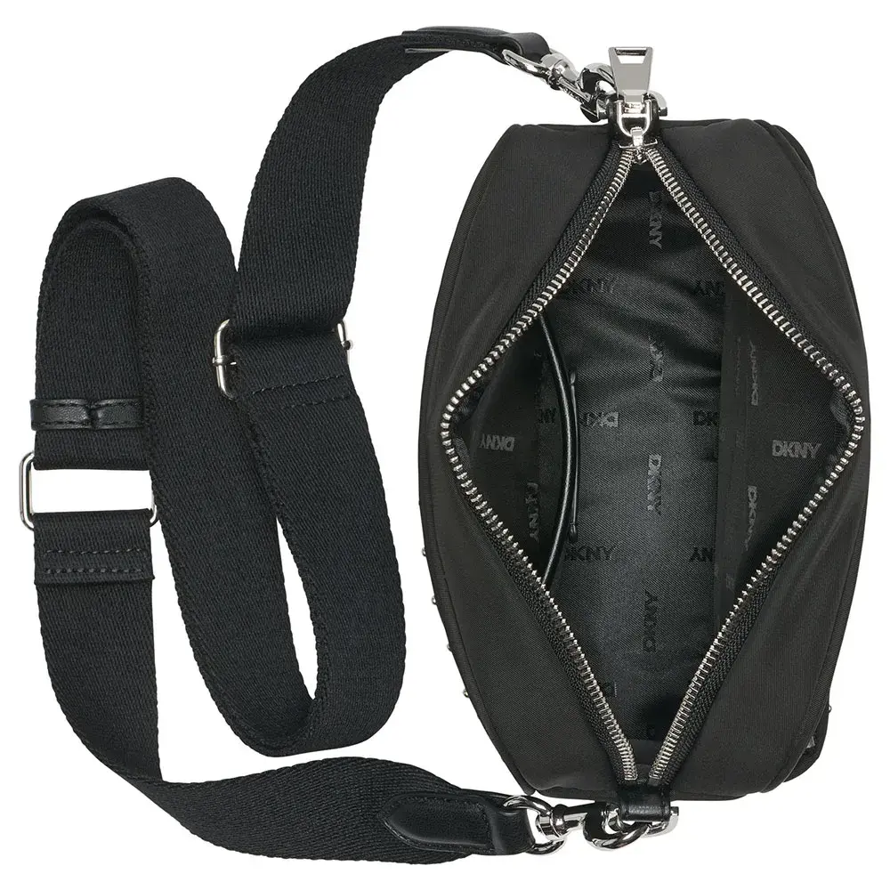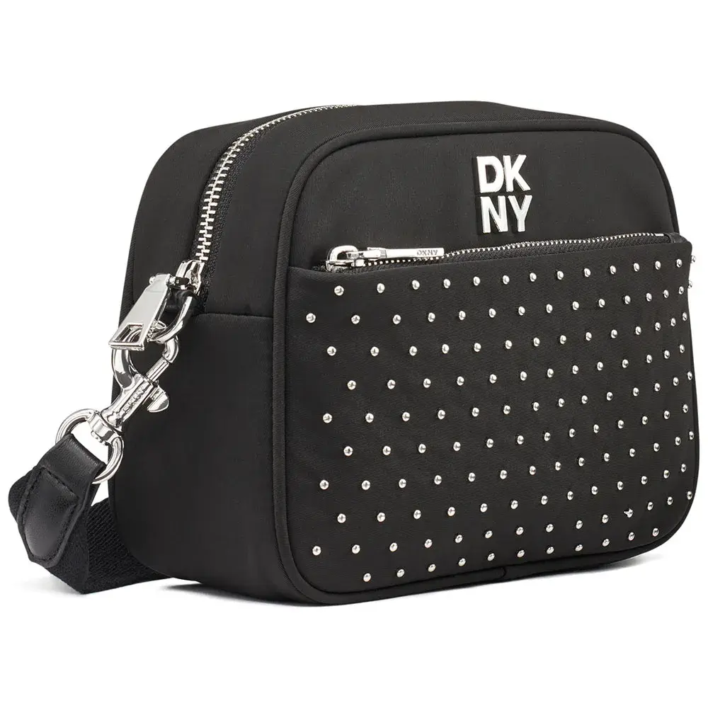 * Логотип: видная серебристая деталь логотипа DKNY спереди