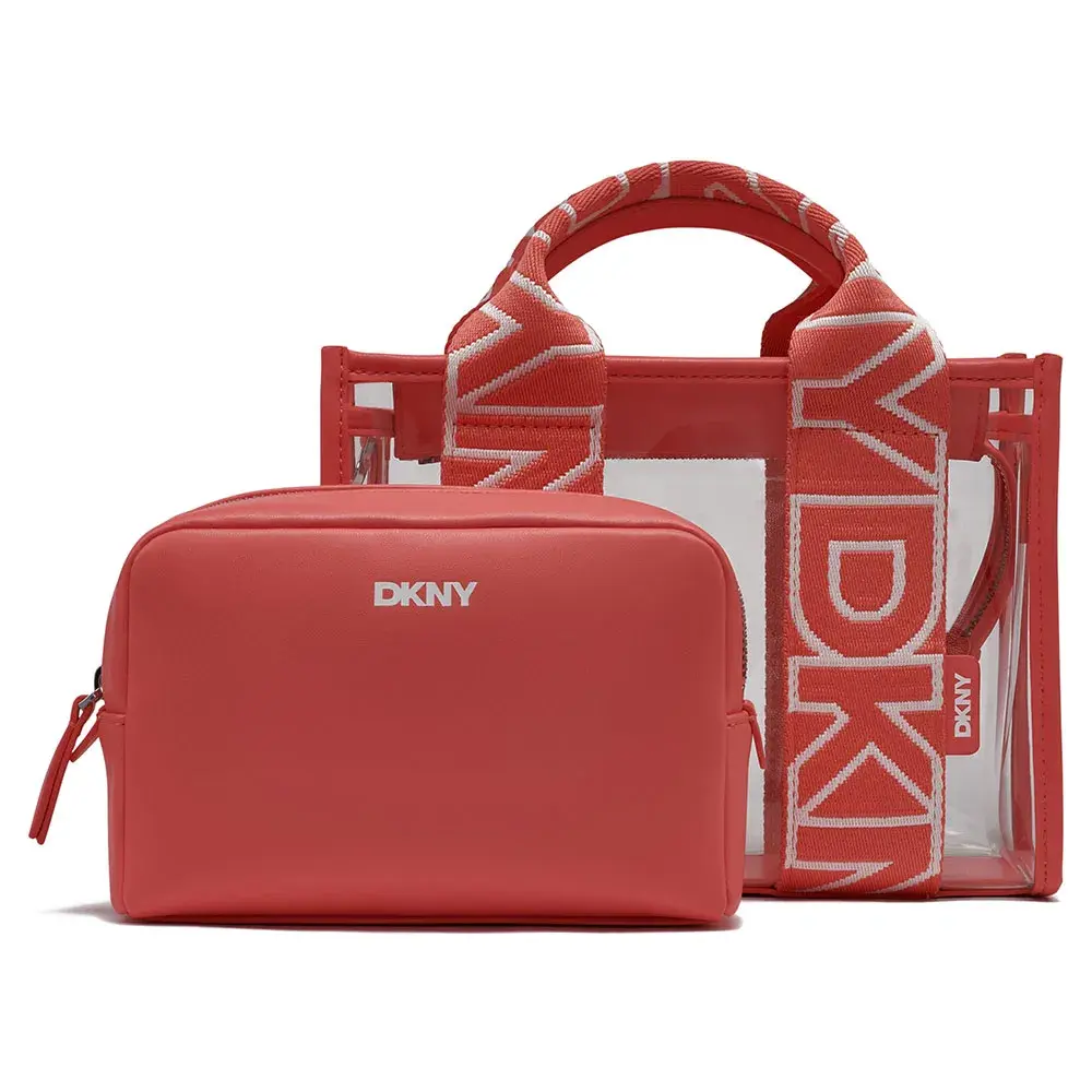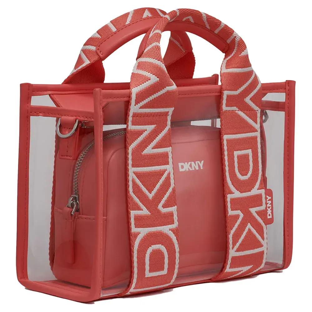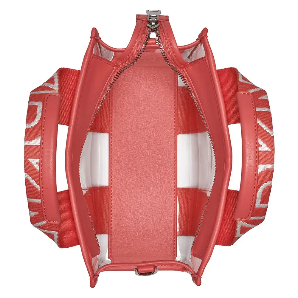Сумка-тоут из прозрачного ПВХ DKNY с двойной ручкой, застежкой-молнией и регулируемым ремешком.