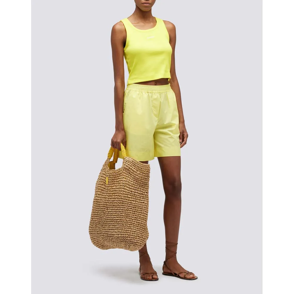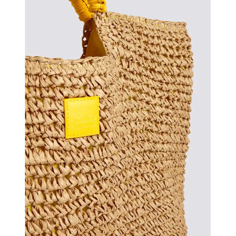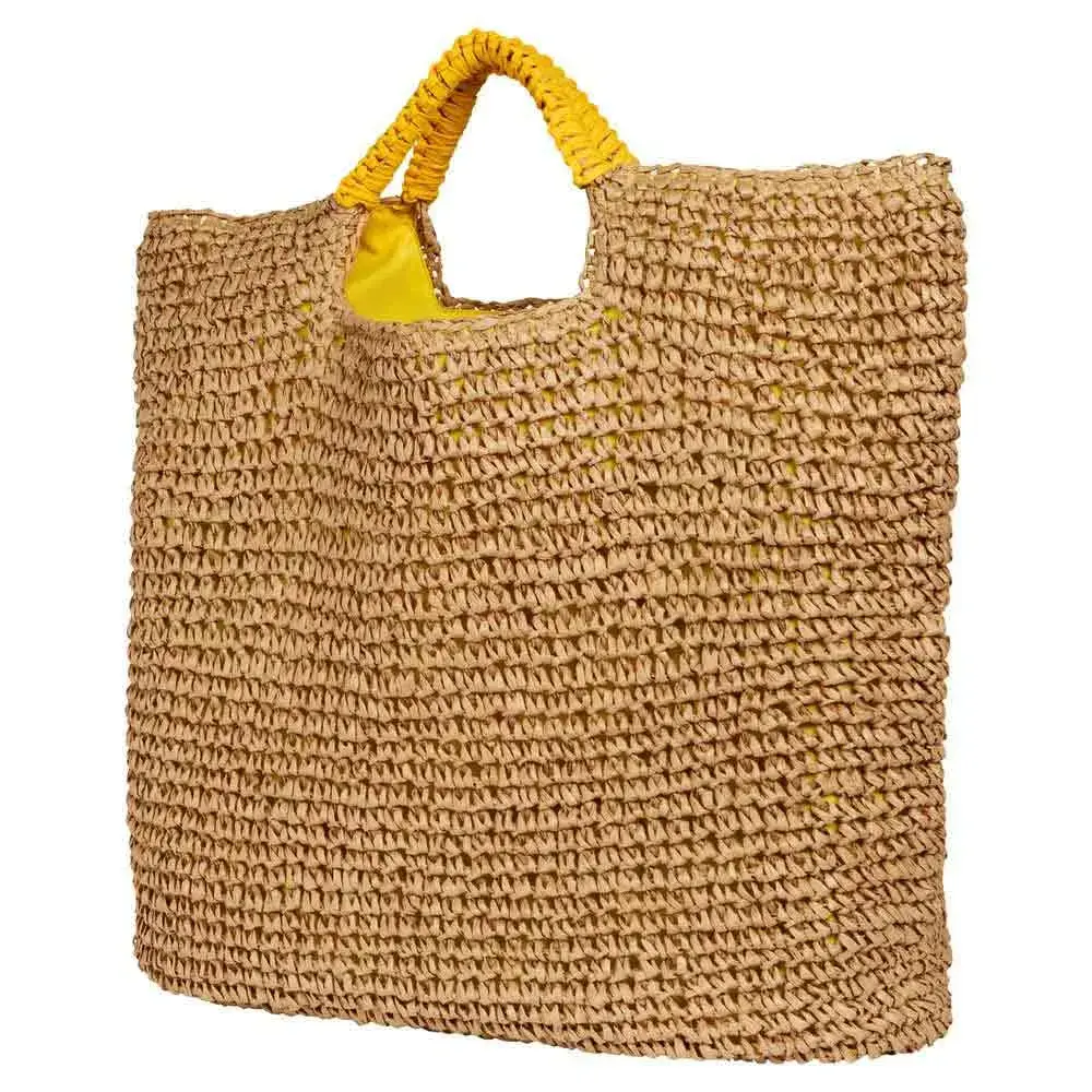 Хозяйственная сумка из бумаги с эффектом соломы и контрастными ручками. Вместительная, с центральной застежкой на молнию, идеально подходит для прогулки или в качестве пляжной сумки.
