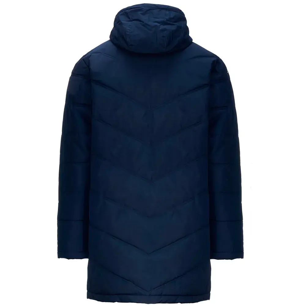 Это мужское длинное стеганое пальто с капюшоном, застегивающимся спереди на молнию, боковыми карманами на молнии и правильной посадкой для удобства надевания.
