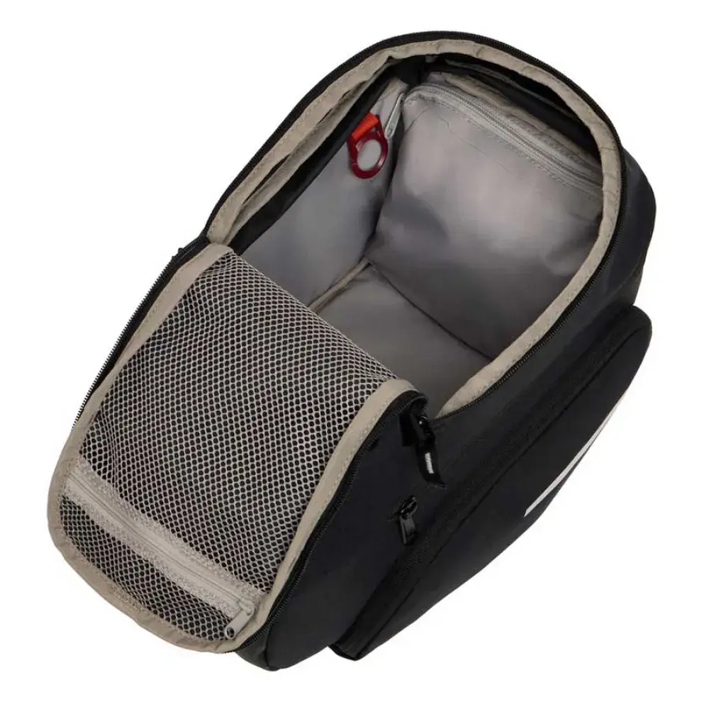 Эта велосипедная сумка оснащена практичными элементами, такими как эластичный шнур на крышке для фиксации дополнительного снаряжения, карман на молнии в клапане для быстрого доступа к необходимым вещам и стратегически расположенные светоотражающие элементы для улучшения видимости в условиях низкой освещенности.