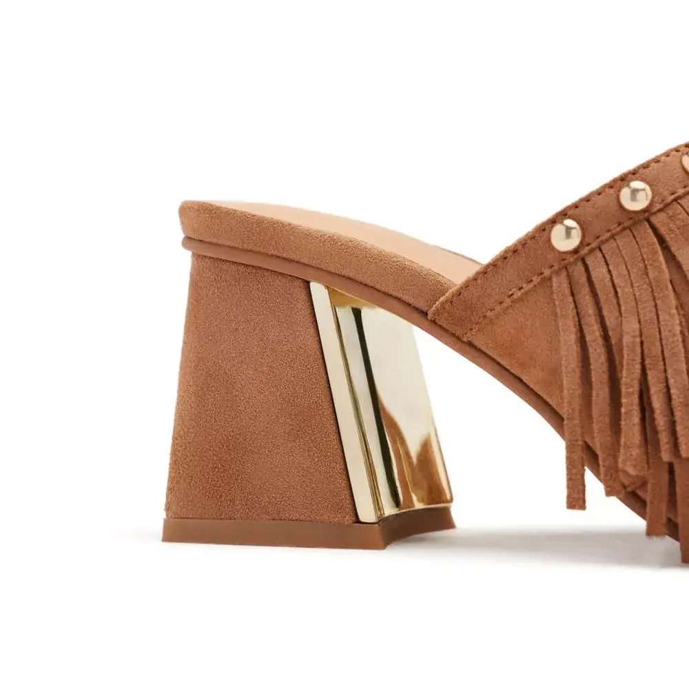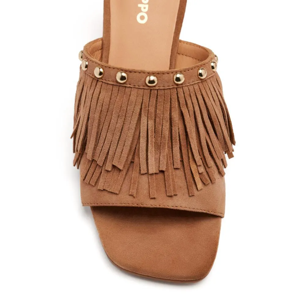 Кожаные сандалии на каблуке с бахромой и заклепками.