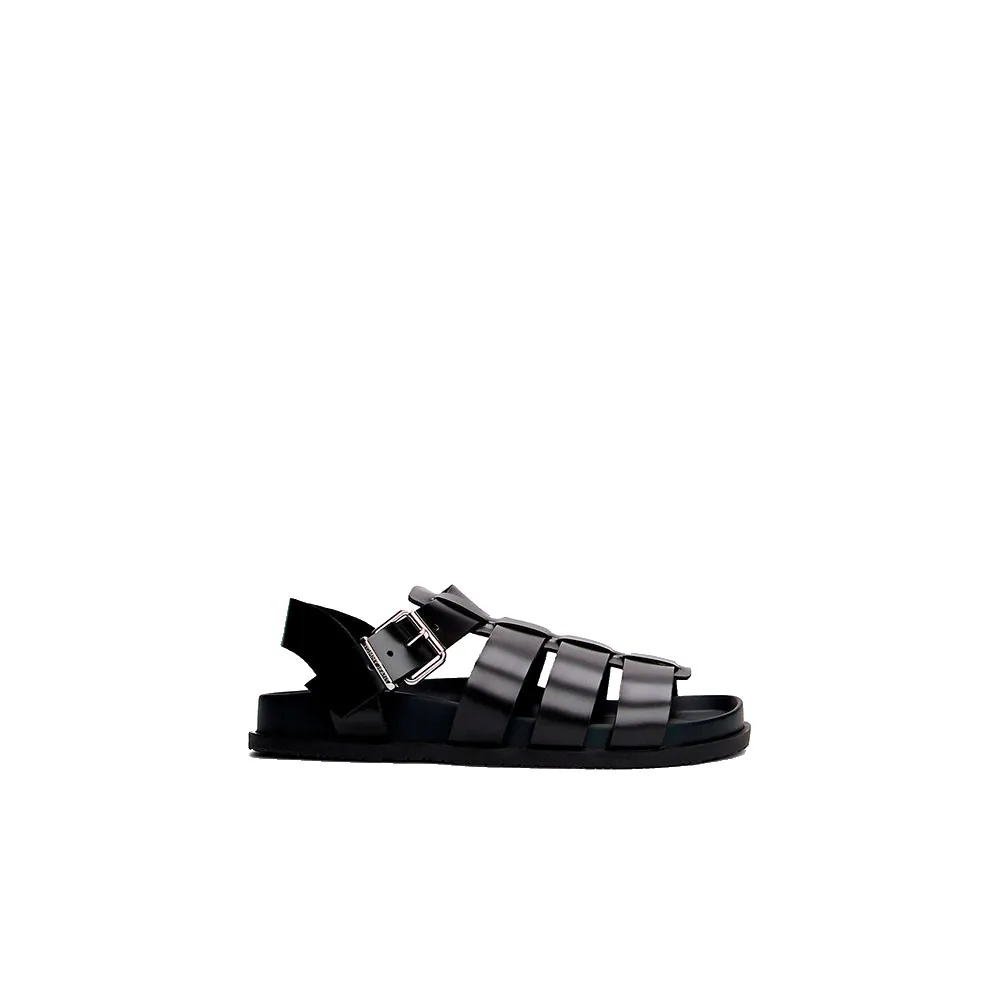 Наденьте эти массивные кожаные рыбацкие сандалии с рельефной лакированной отделкой, фигурной стелькой и застежкой-пряжкой.
