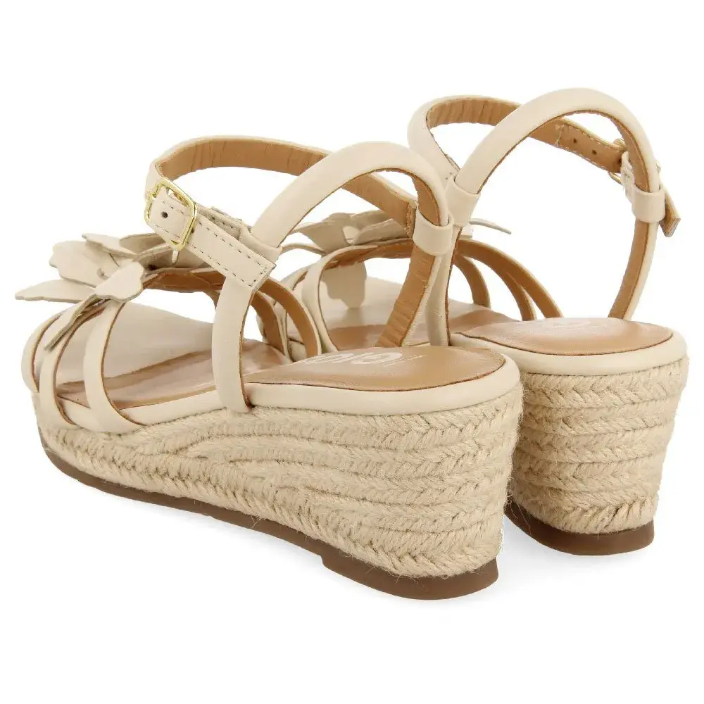 Белоснежные кожаные сандалии с ремешками и цветочным декором на джутовой танкетке средней высоты.