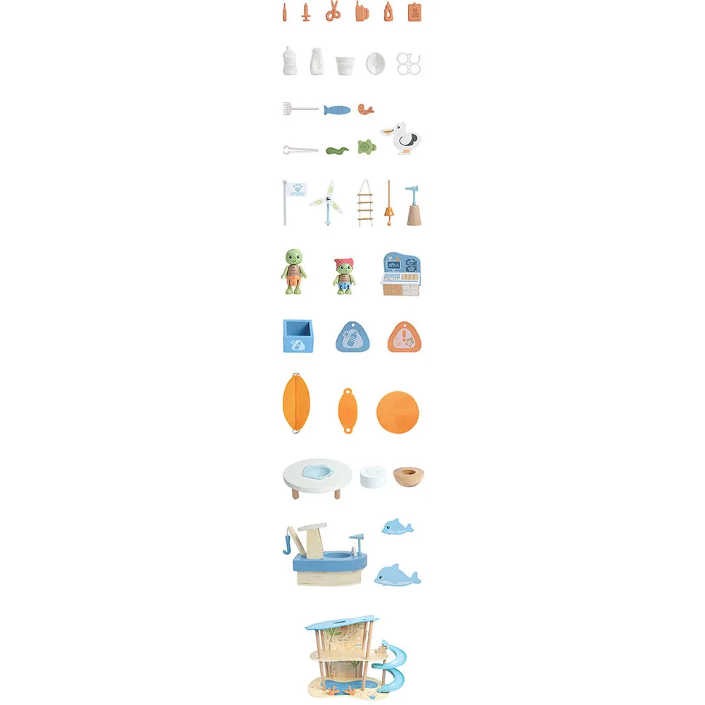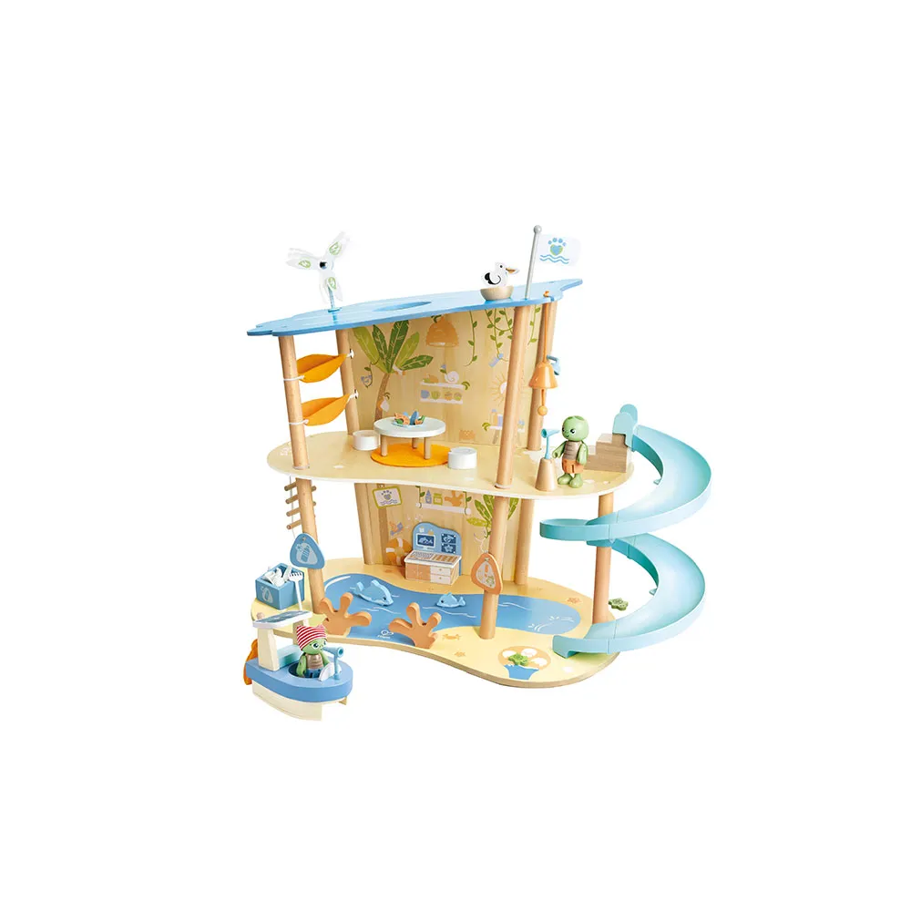 Обучающий деревянный игровой набор с двухэтажным основанием, горкой, солнечной лодкой, вращающейся ветряной мельницей и спасательными принадлежностями.