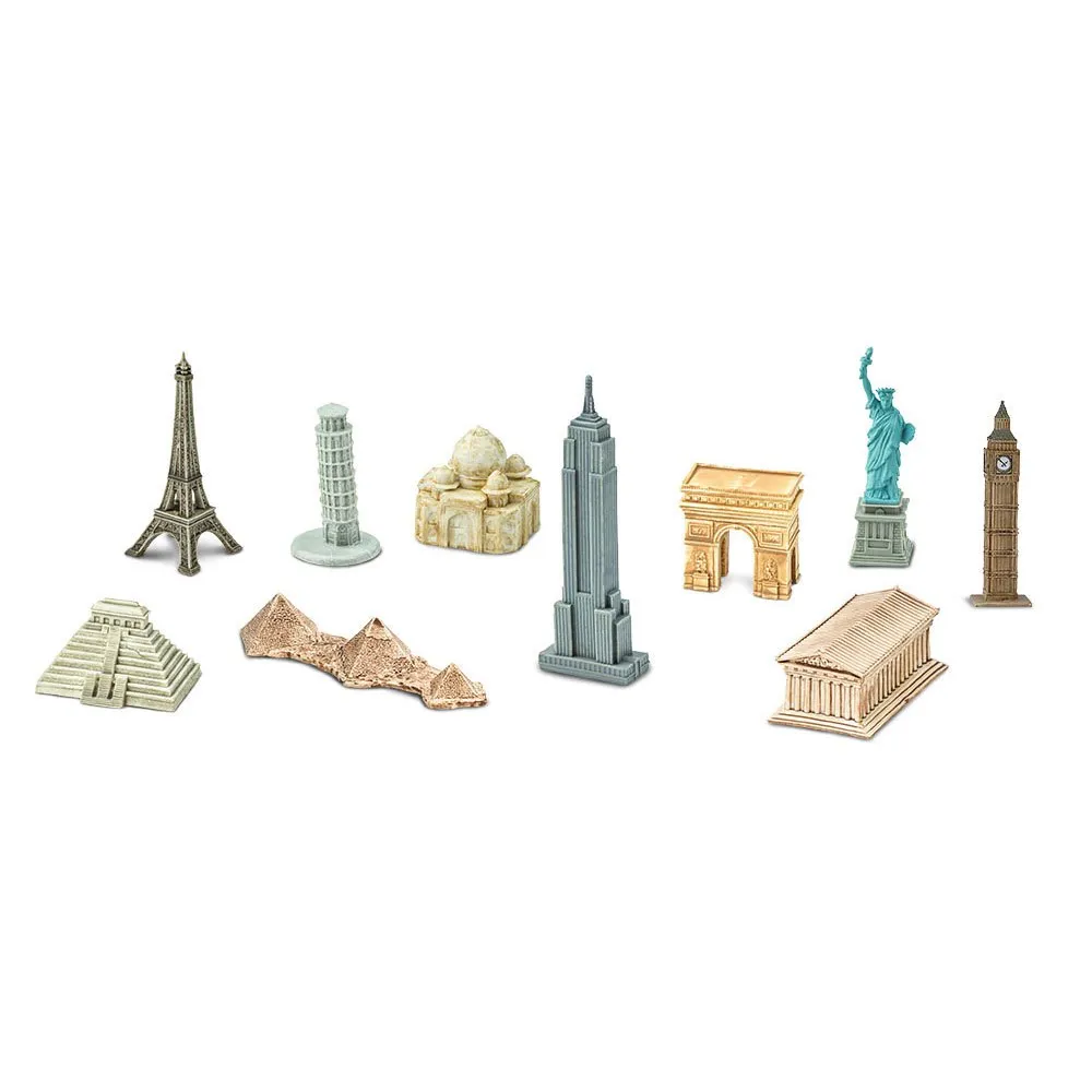 - Характеристики: В этом наборе представлены десять уникальных миниатюрных архитектурных памятников со всего мира: Эйфелева башня, Пизанская башня, Тадж-махал, Храмы надписей, Эмпайр-Стейт-билдинг, пирамиды Гизы, Биг-Бенс, Статуи Свободы, Парфеноны и Триумфальные арки.