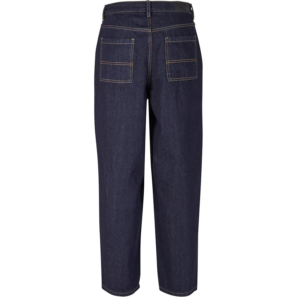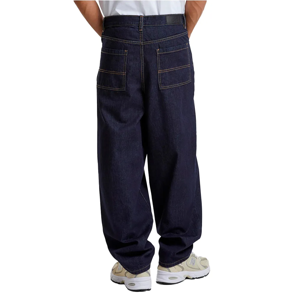 Эти широкие мужские джинсы в бескомпромиссном ретро-стиле с оверсайз-кроем, прямыми широкими штанинами и низкой посадкой в промежности в соответствии со стилем 90-х. Также есть два боковых кармана и два больших накладных кармана сзади. Пояс мужских джинсов выполнен в традиционном стиле со шлевками для ремня, пуговицей и молнией. Мужские джинсы изготовлены из проверенного хлопка.