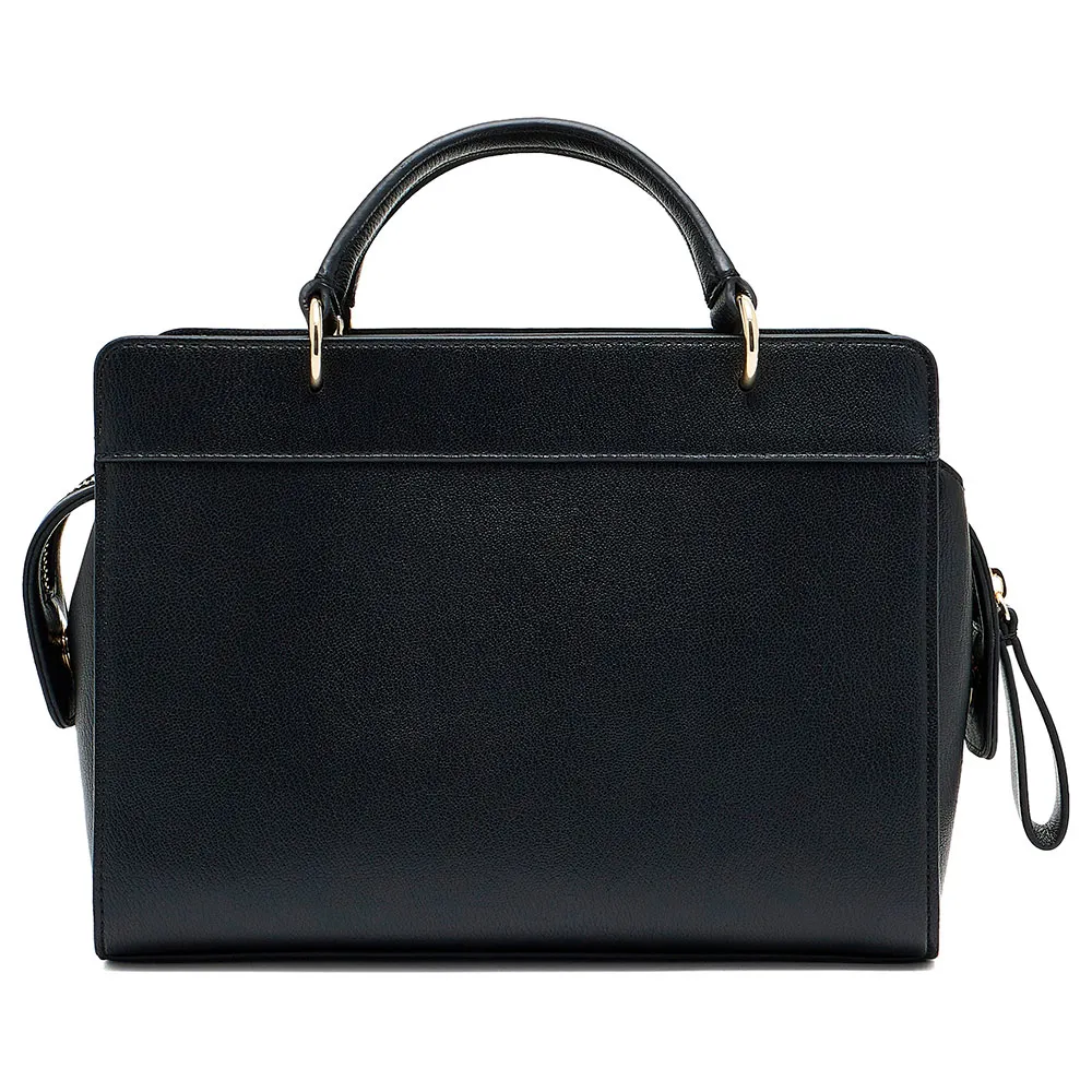Основные особенности включают функциональную металлическую молнию спереди с характерной петлей для вытягивания, металлические застежки на ручках и длинную верхнюю молнию в рамке из искусственной кожи, которая проходит по всей длине сумки и застегивается с обеих сторон на кнопки для дополнительной безопасности.