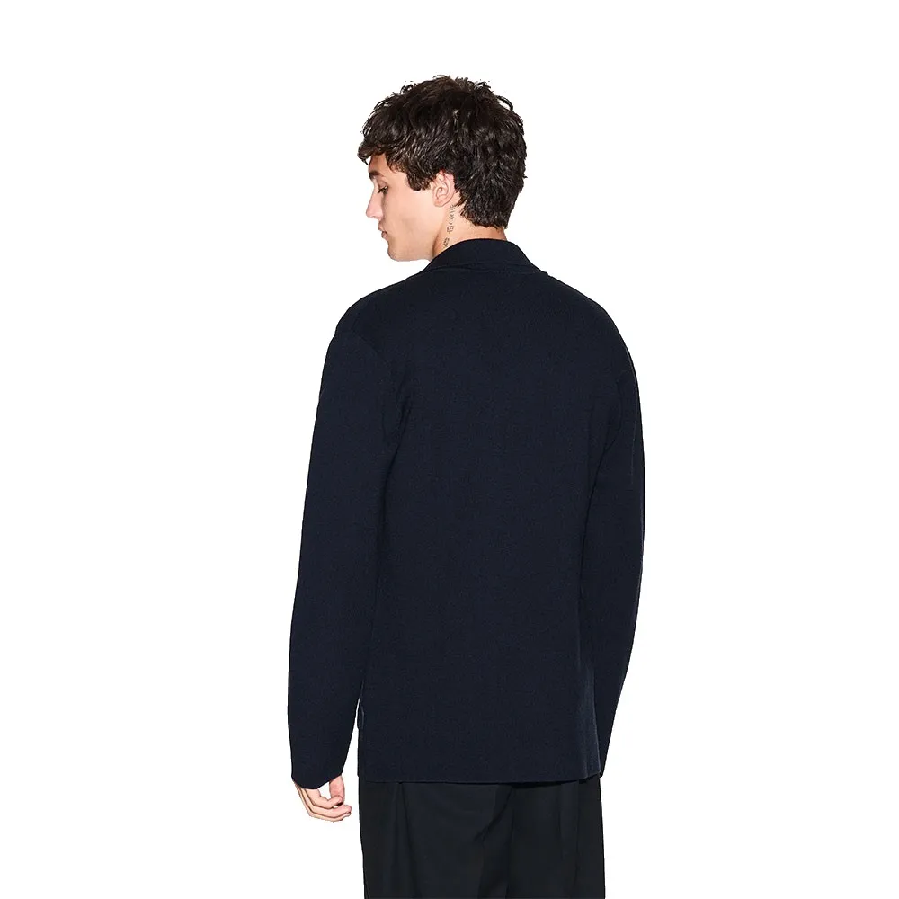 Вязаный однобортный блейзер, застежка на две пуговицы, козырек с лацканами, накладные карманы.
