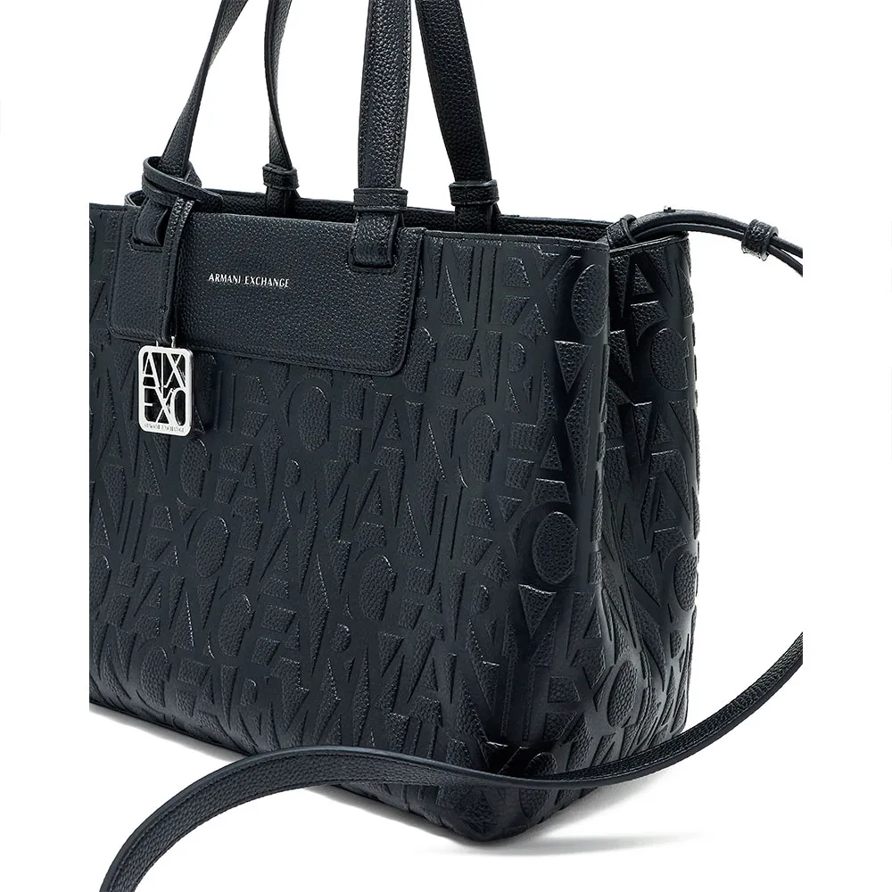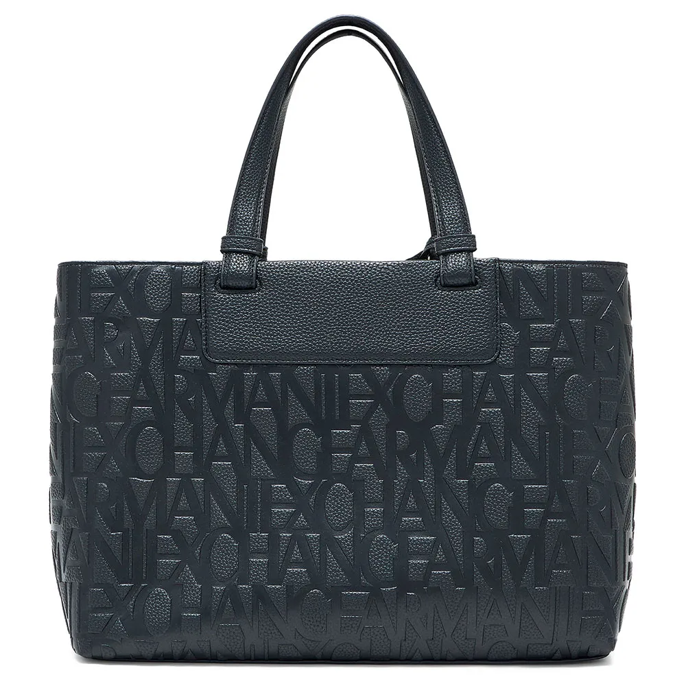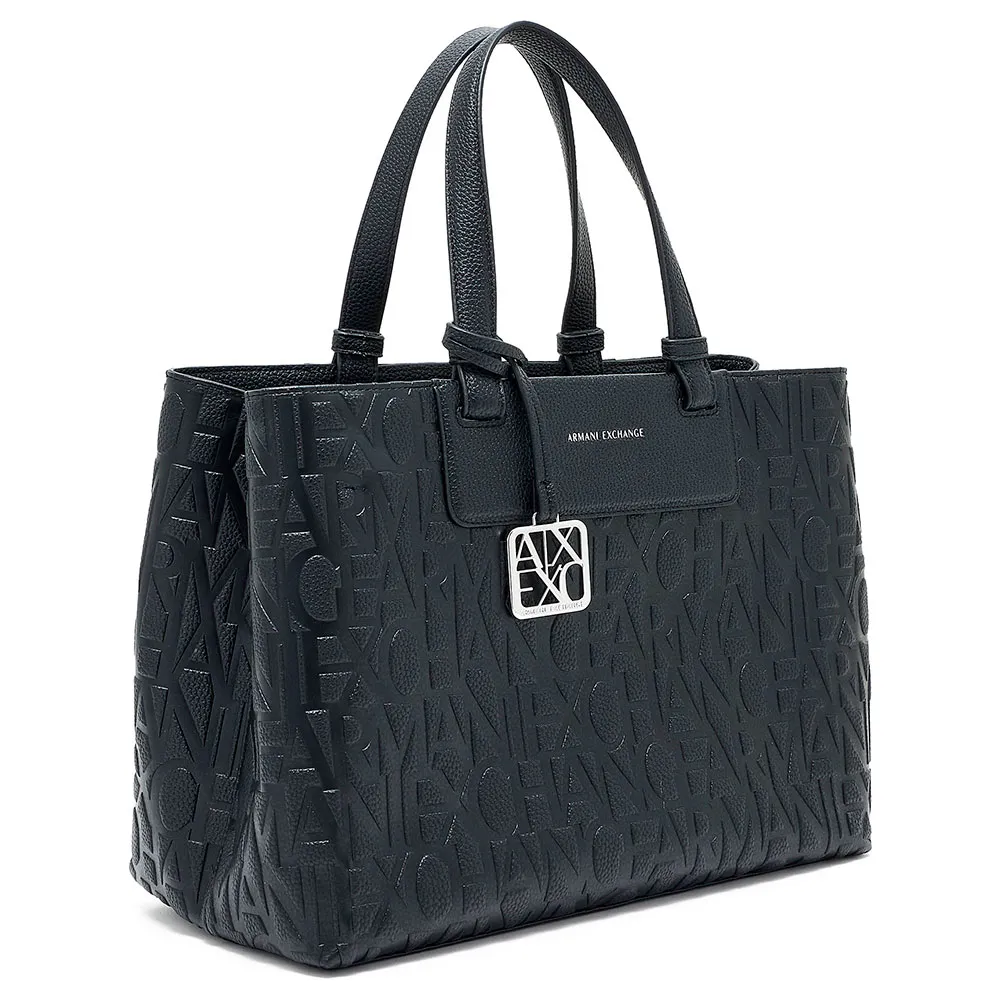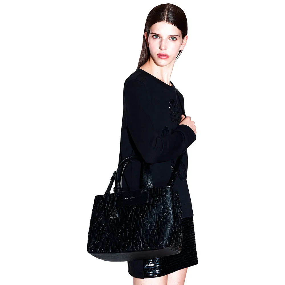 Семейство практичных, полуструктурированных сумок изготовлено из прочных материалов с тиснением логотипа Armani Exchange по всей поверхности, украшено накладкой из искусственной кожи с нанесенными термопечатью на фольге буквами с полным фирменным логотипом.