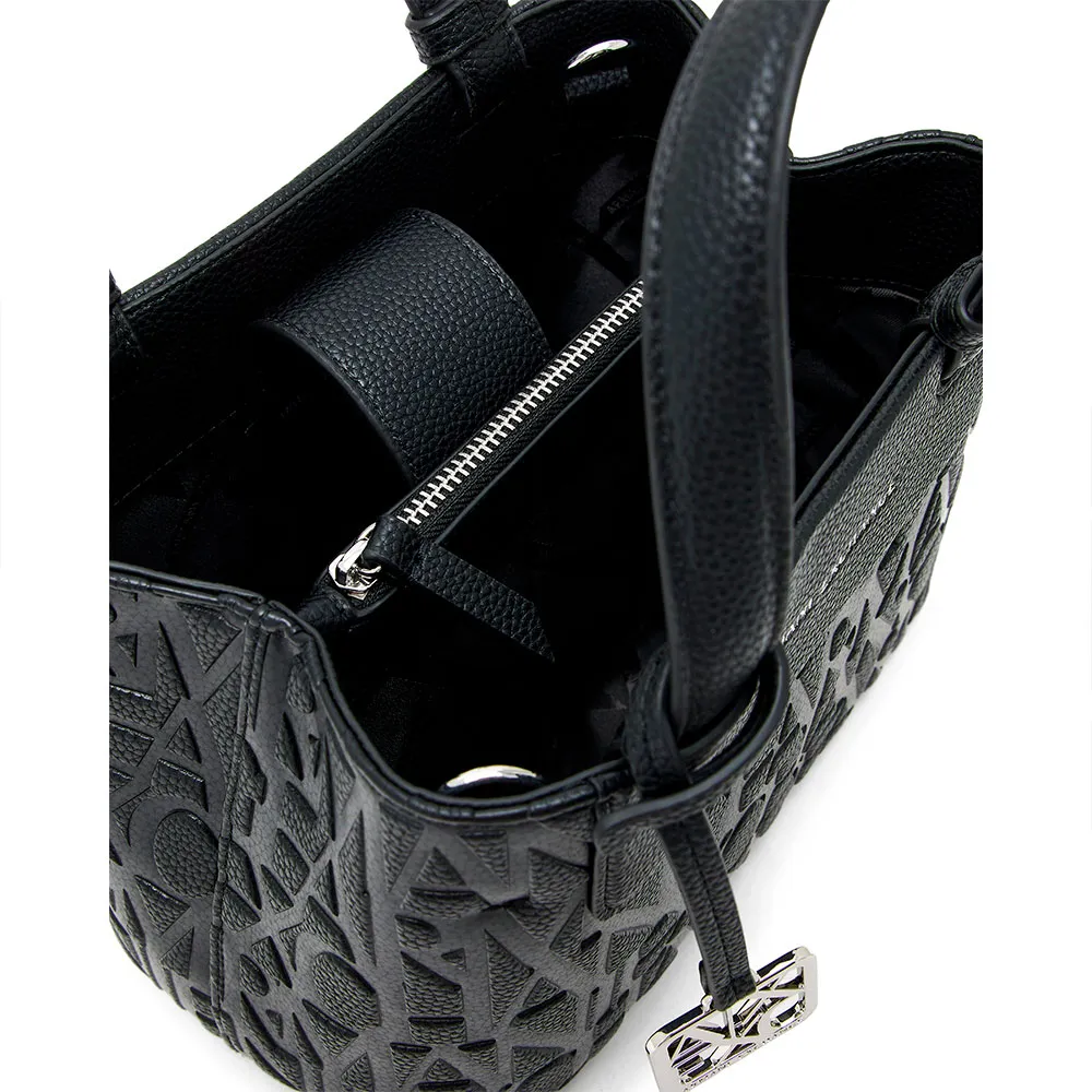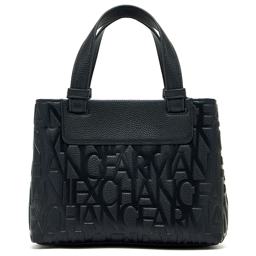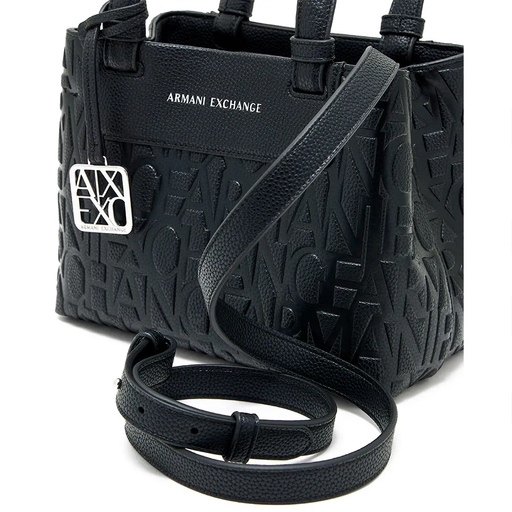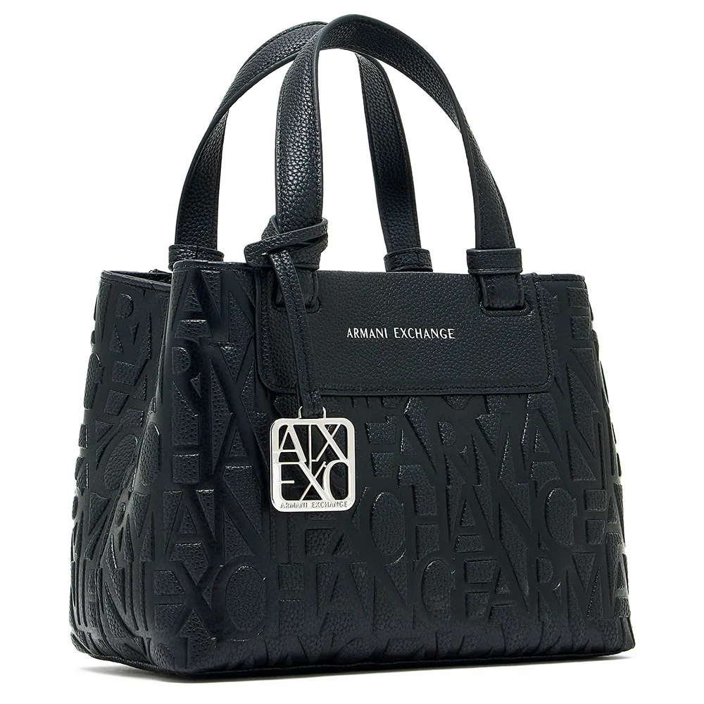 Семейство практичных, полуструктурированных сумок изготовлено из прочных материалов с тиснением логотипа Armani Exchange по всей поверхности, украшено накладкой из искусственной кожи с нанесенными термопечатью на фольге буквами с полным фирменным логотипом.