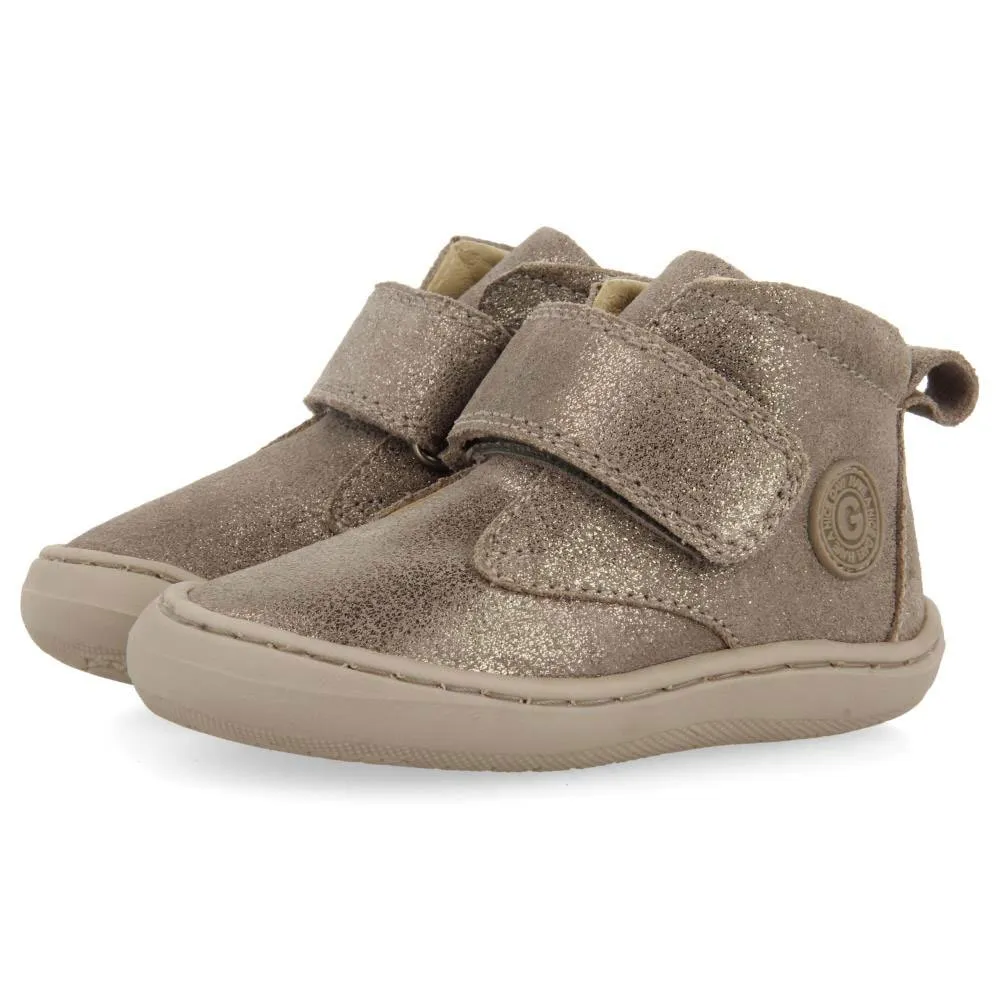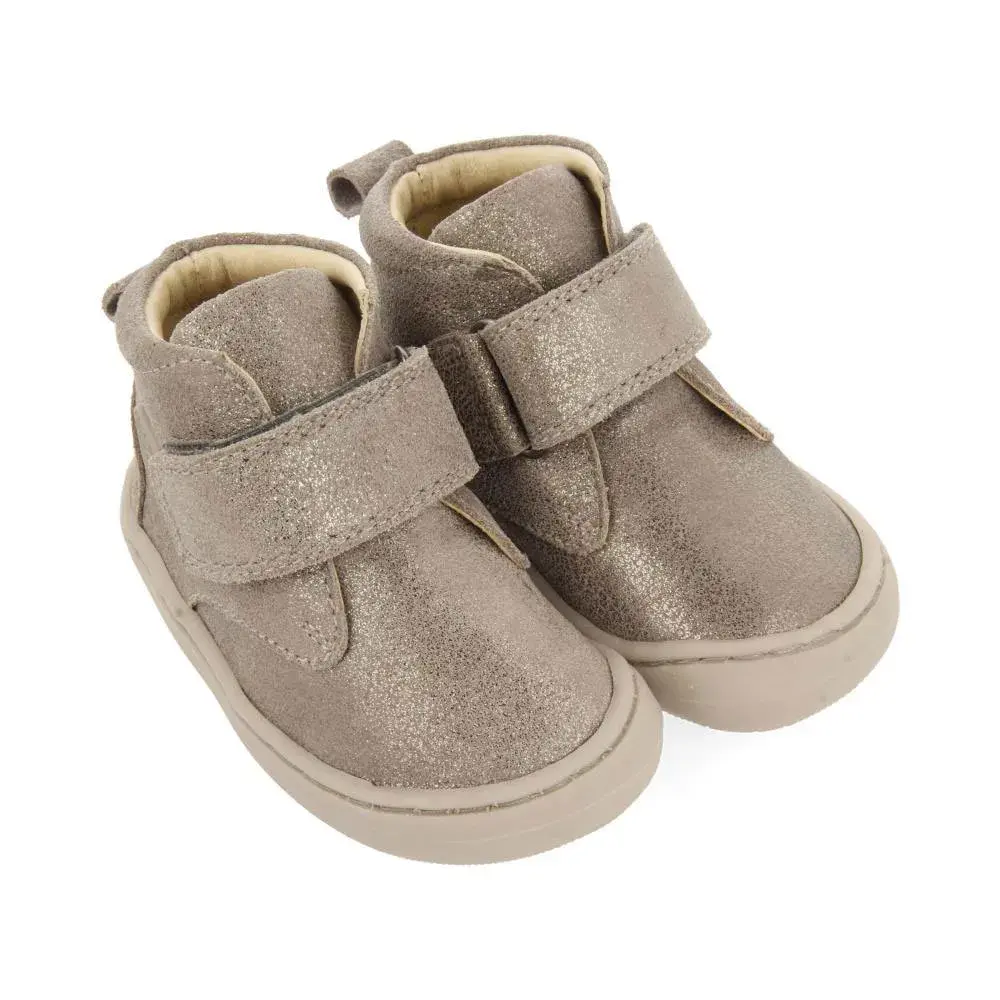 Серые ботильоны с блестками и регулируемыми застежками без анатомических элементов, которые могли бы препятствовать оптимальному развитию стопы.