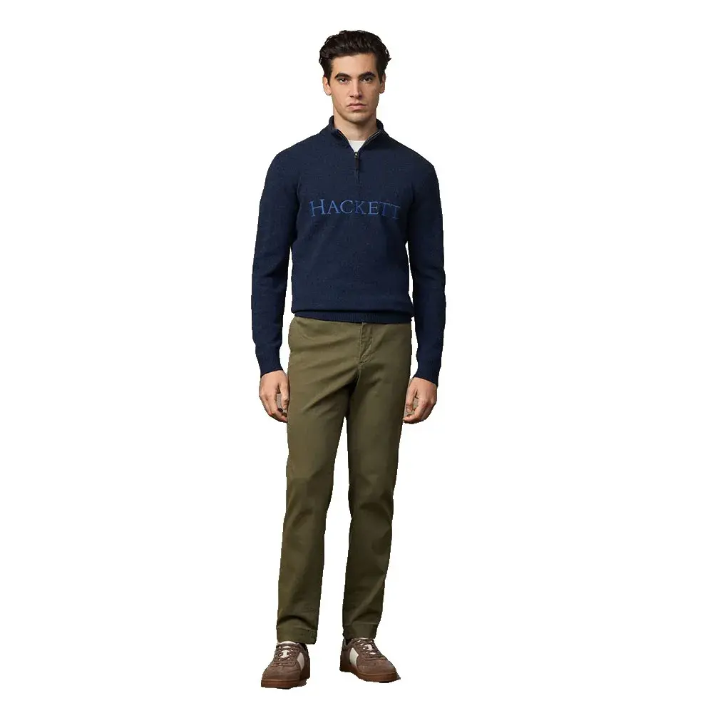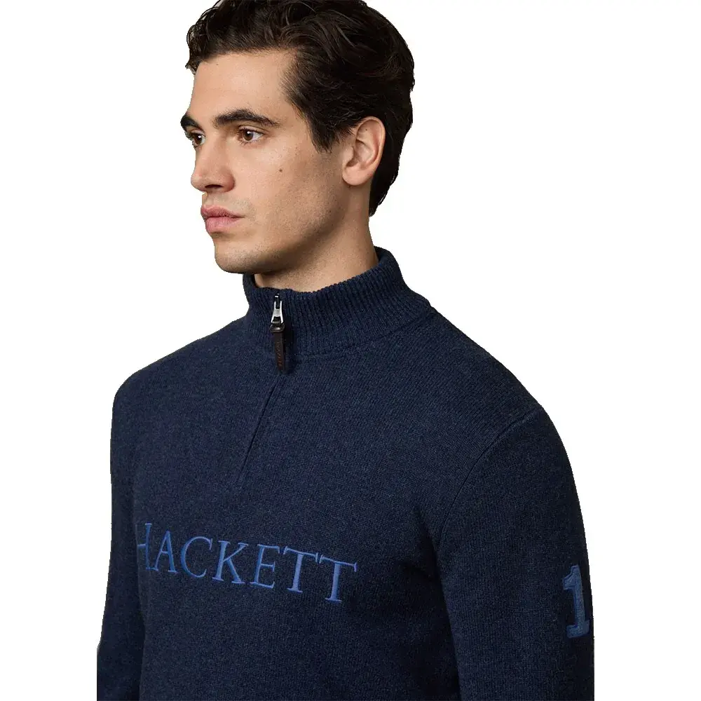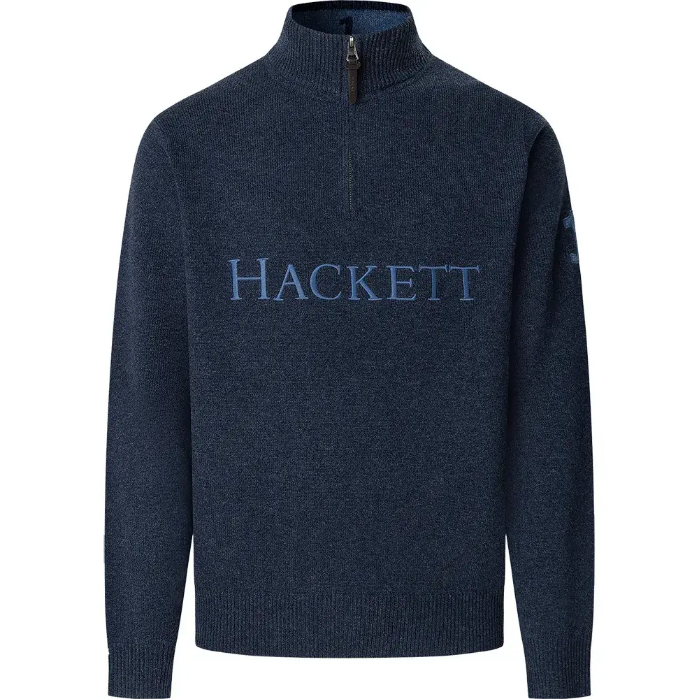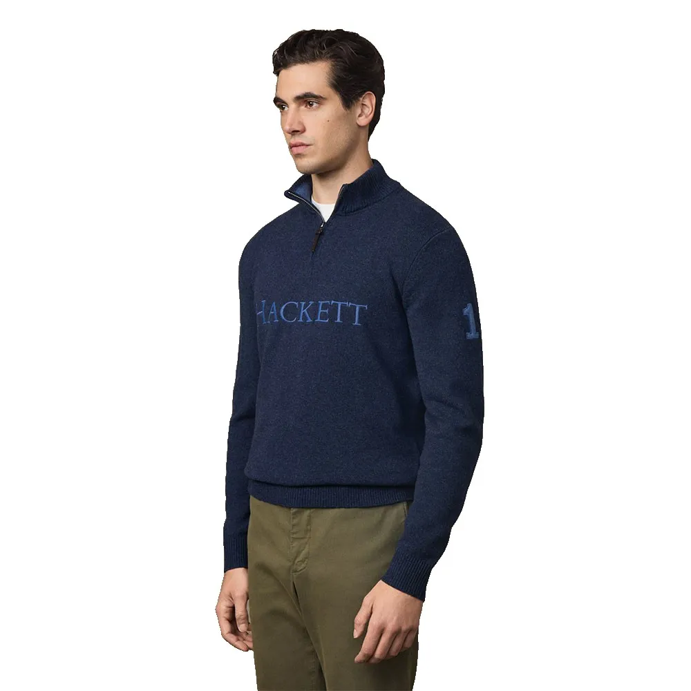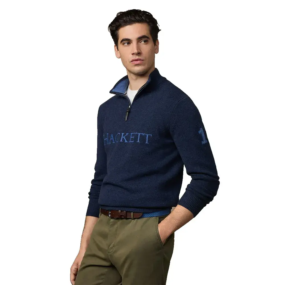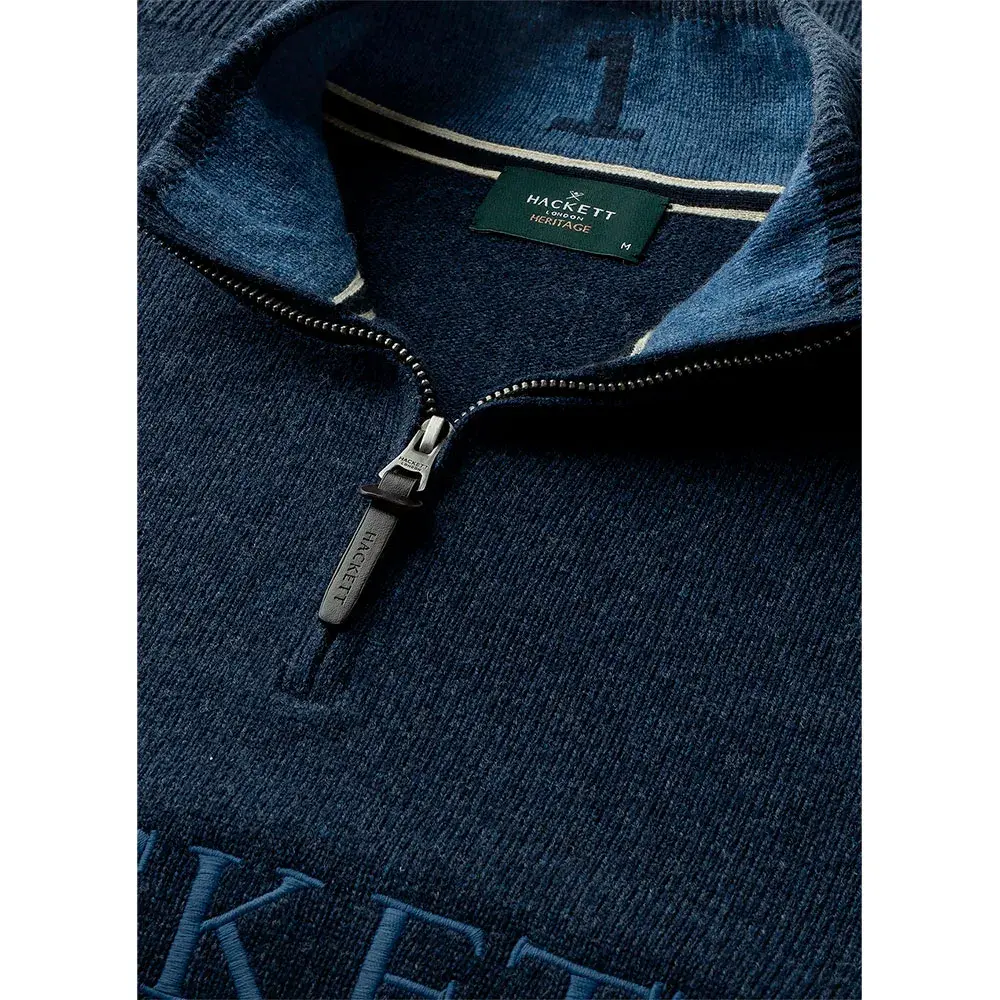 Hackett Heritage Archive Number One в классическом стиле на молнии, вязаное изделие из натуральной овечьей шерсти с вышитым фирменным знаком "Хакетт" на груди, аппликацией № 1 в верхней части левого рукава и интарсией № 1 на внутренней стороне горловины сзади.