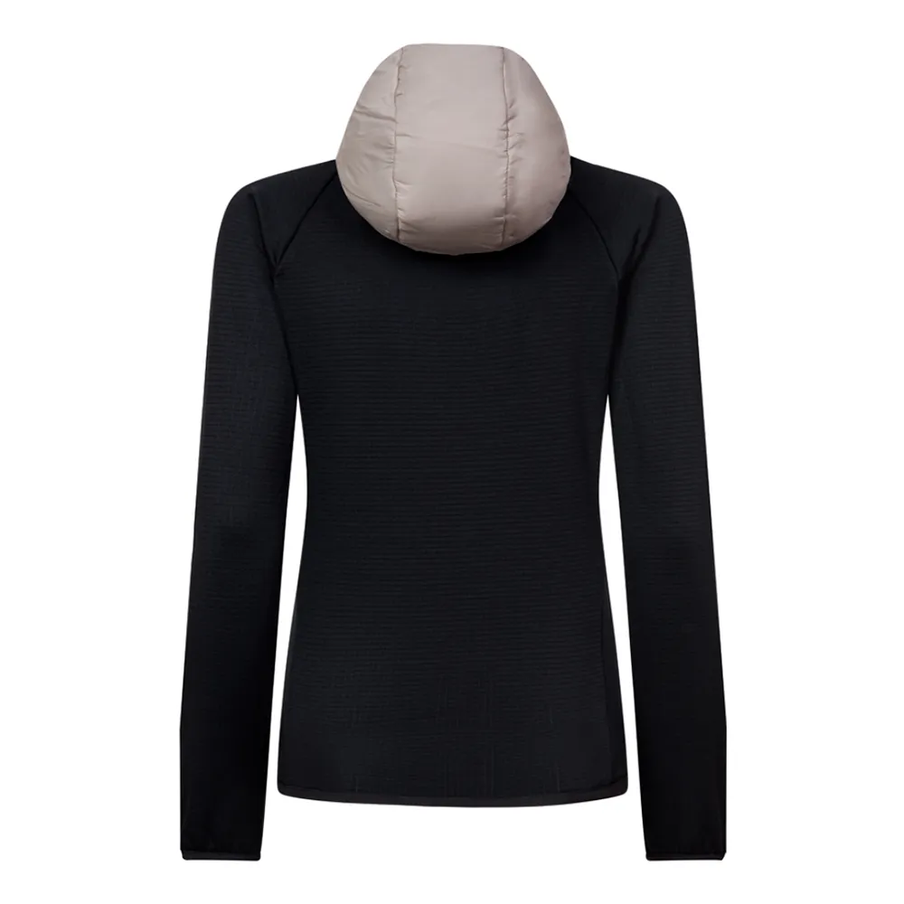 Гибридная куртка с рукавами, спинкой и боковыми панелями из эластичного флиса с рельефным рисунком сетки для удержания тепла и отвода влаги. Передняя часть и капюшон выполнены из нейлона и полиэстера с подкладкой для тепла и защиты. Лента из лайкры для отверстия капюшона, нижней части рукавов и нижней части изделия (по бокам и сзади).