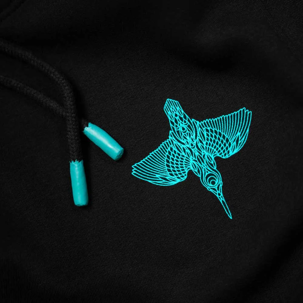 Take Flight - графическая дань уважения культовому зимороду. В этой модели используются иллюстрации с использованием ключевых линий, передающие стремительное движение, а оттенки электрик-синего и медного цвета буквально вкрапляются в нее, приобретая почти трехмерный вид. Четырехцветная трафаретная печать на нашей невероятно мягкой и роскошной ткани плотностью 320 г с начесом и наконечниками шнуров в тон.