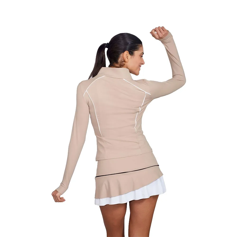 Она изготовлена из высококачественных и дышащих материалов, что обеспечивает хорошую вентиляцию и комфорт во время занятий спортом. Бежевый цвет придает изделию нейтральный и элегантный вид, позволяя легко сочетать его с различными предметами одежды и стилями.
