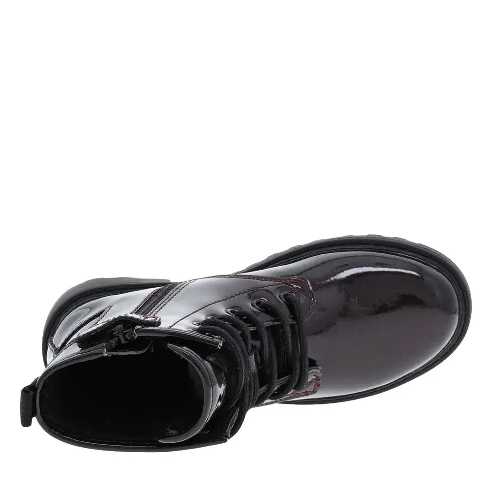 Бордовые ботинки с блестящей лакированной кожей по всей поверхности.