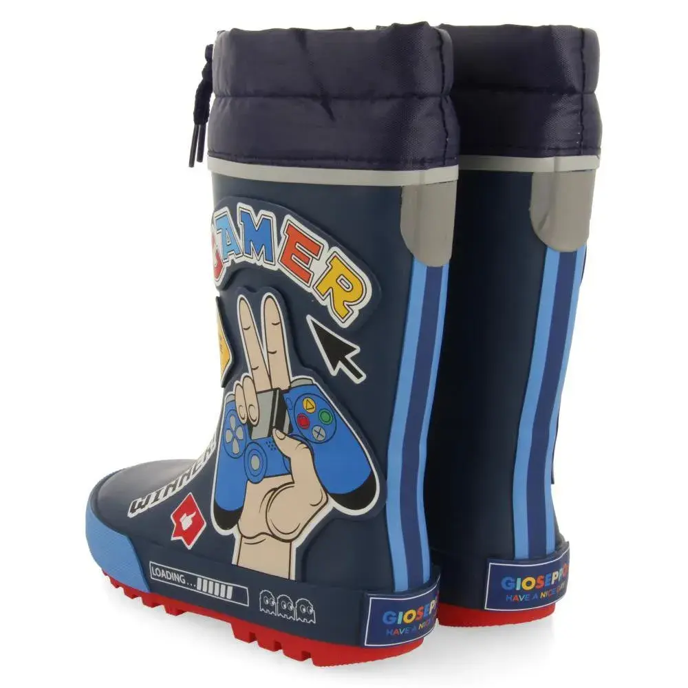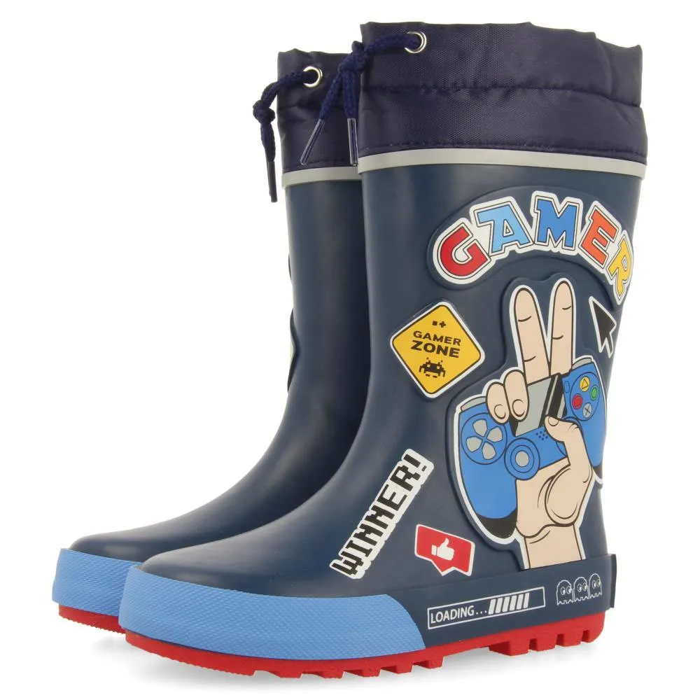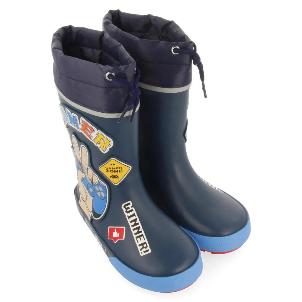 Готовы к дождливым дням! Темно-синие непромокаемые ботинки с нашивками геймеров.
