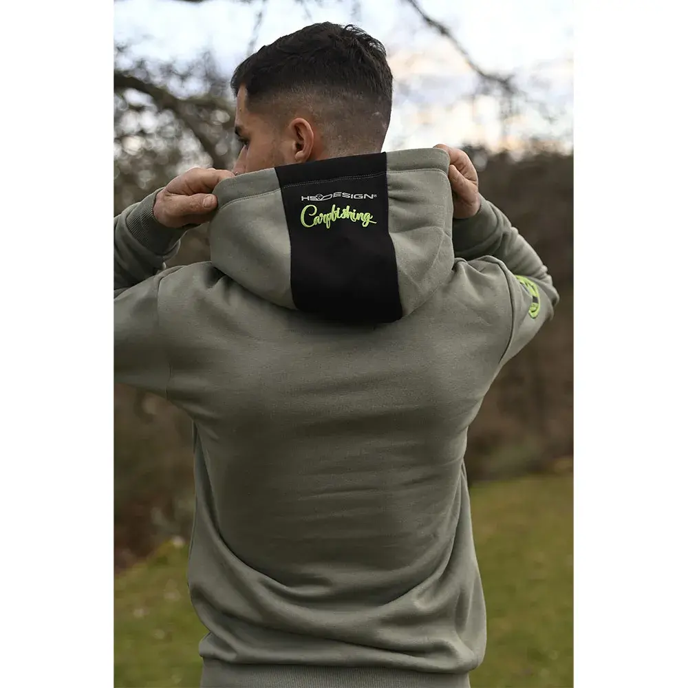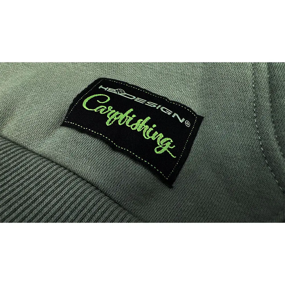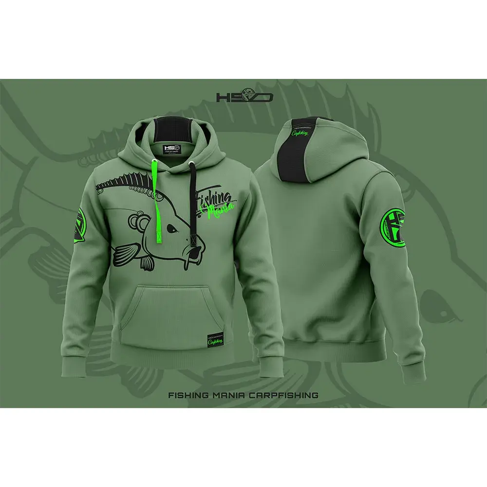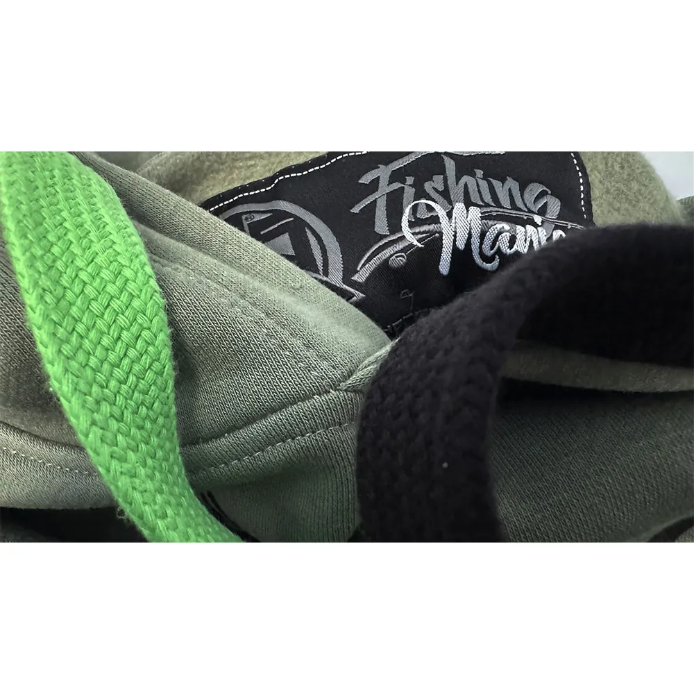 Графика Carpfishing Mania хорошо известна нашим клиентам. В этой версии наша команда дизайнеров выбрала привлекательную ткань зеленого цвета и использовала только контуры большого карпа на груди, что позволило добиться более мягкого эффекта, но в сочетании с более заметными деталями, такими как ярко-зеленый принт, двухцветные шнуры в тон принту и капюшон с тремя полосами контрастного цвета с тисненым принтом Carpfishing.
