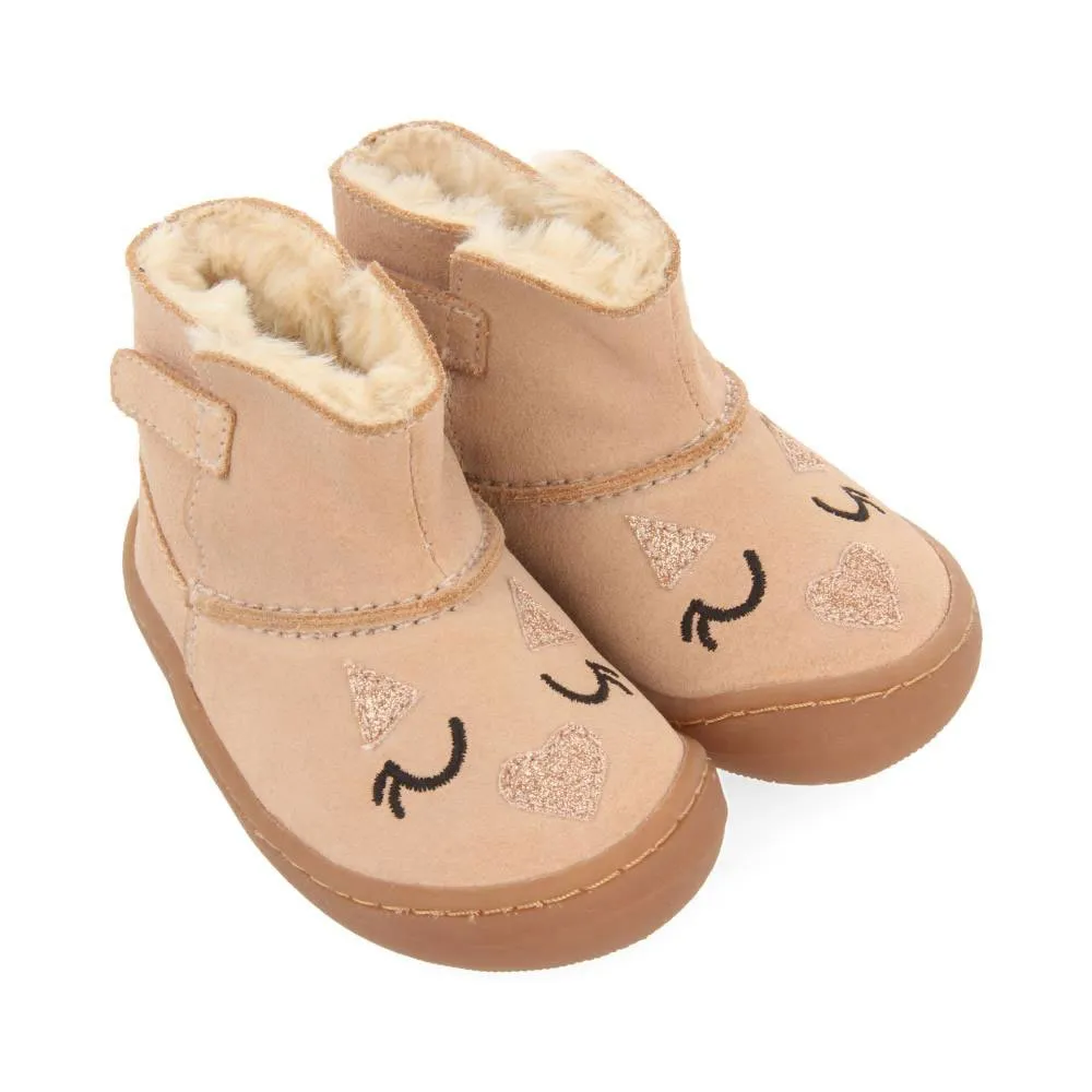 Розовые ботильоны с вышивкой и регулируемыми застежками без анатомических элементов, которые могли бы препятствовать оптимальному развитию стопы.