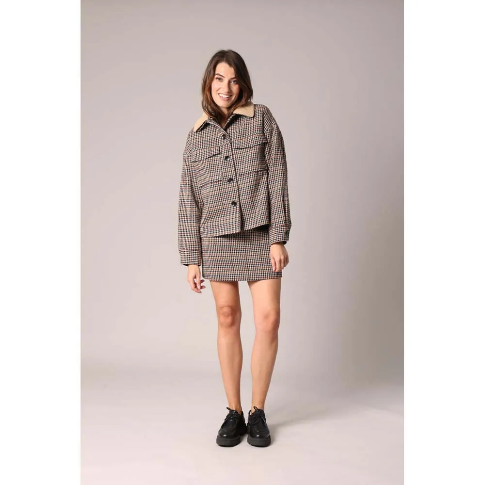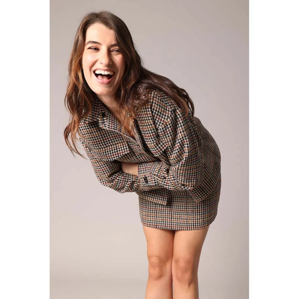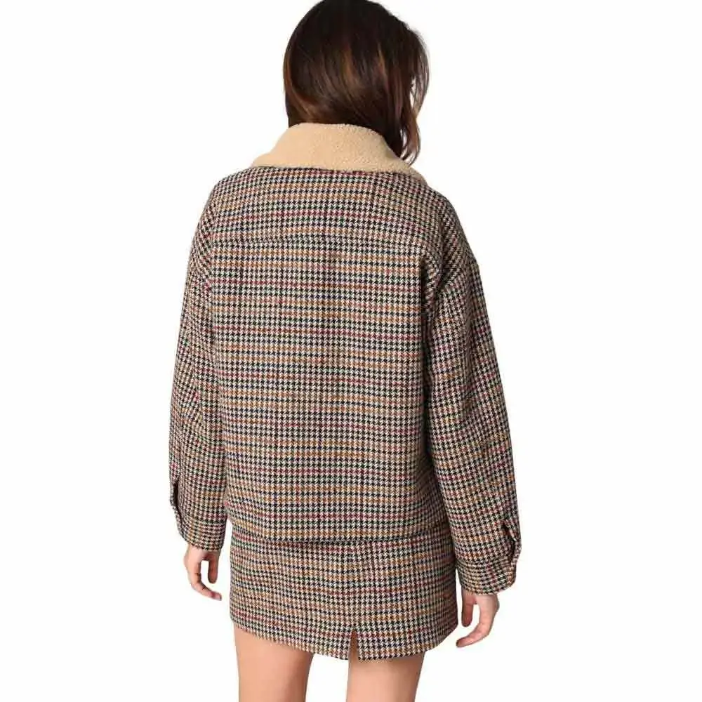 Жакет LITCHI перенесет вас в клетчатое путешествие между смелым винтажем и удобной современностью. Разноцветный узор в виде собачьих клыков придает глубину любому образу, а воротник из овчины нашепчет вам на ухо приятные слова в прохладные дни. Он застегивается на большие черные пуговицы для создания яркого визуального эффекта и гордо демонстрирует два накладных кармана с клапанами на груди, идеально подчеркивающих стиль и практичность. Структурированный крой выгодно подчеркивает фигуру, независимо от того, носите ли вы его в дуэте с юбкой в тон или соло поверх джинсов.