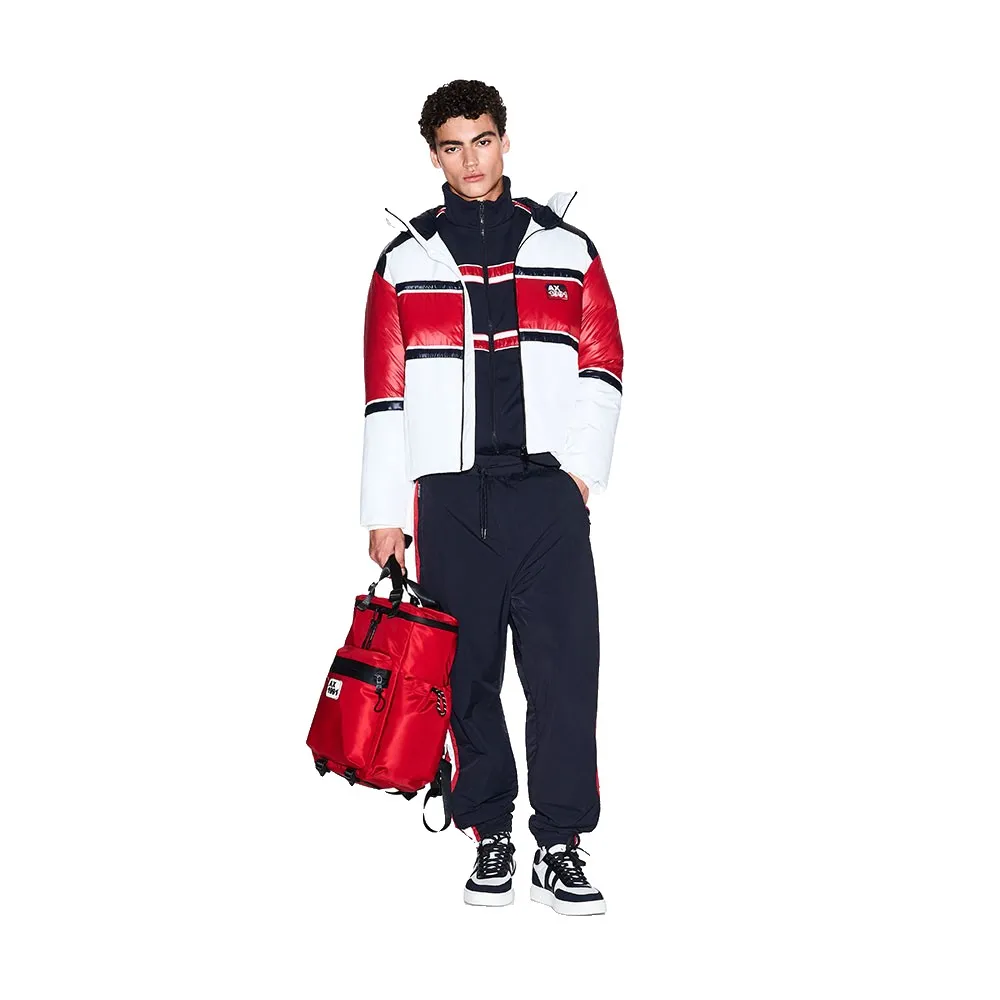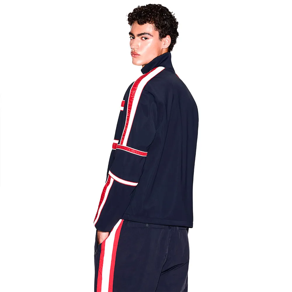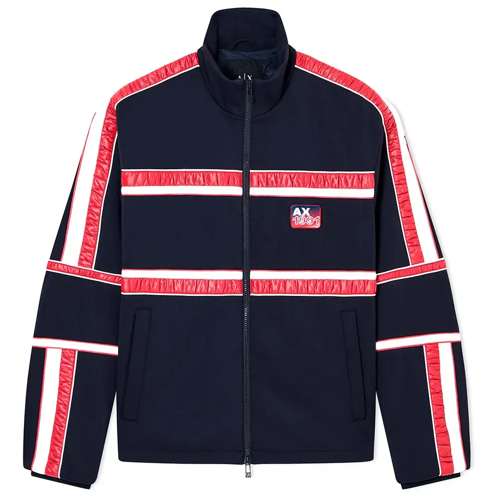 Жакет-блузон на молнии с рельефным вырезом, блестящими нейлоновыми вставками контрастного цвета, прорезными карманами на молнии, манжетами и нашивкой с логотипом на груди.