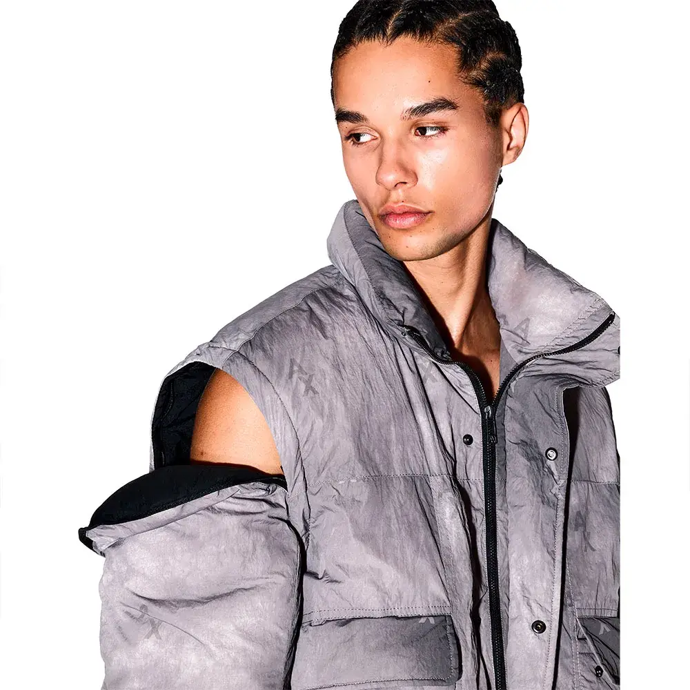Жакет-блузон с полной застежкой-молнией, рельефным вырезом горловины на кнопках, съемными рукавами, накладными карманами с клапанами и манжетами в рубчик, сплошным логотипом.