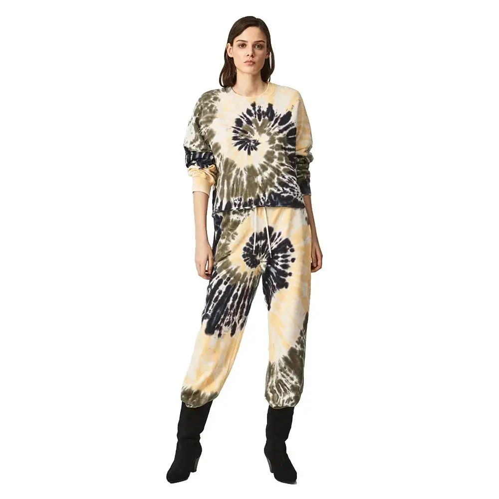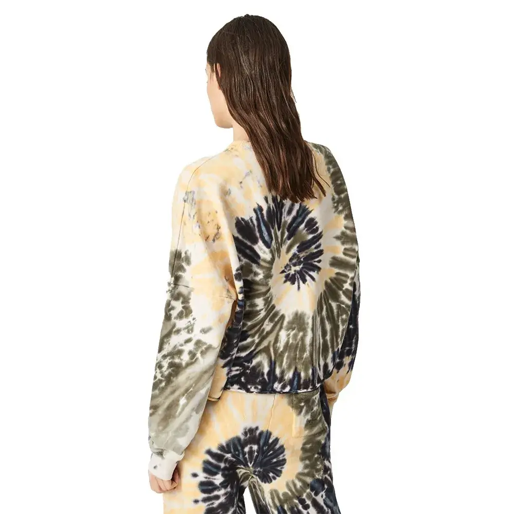 Круглый вырез горловины, мягкая ткань, многоцветный принт в виде батика, обтрепанный низ, эластичные манжеты, свободный крой.