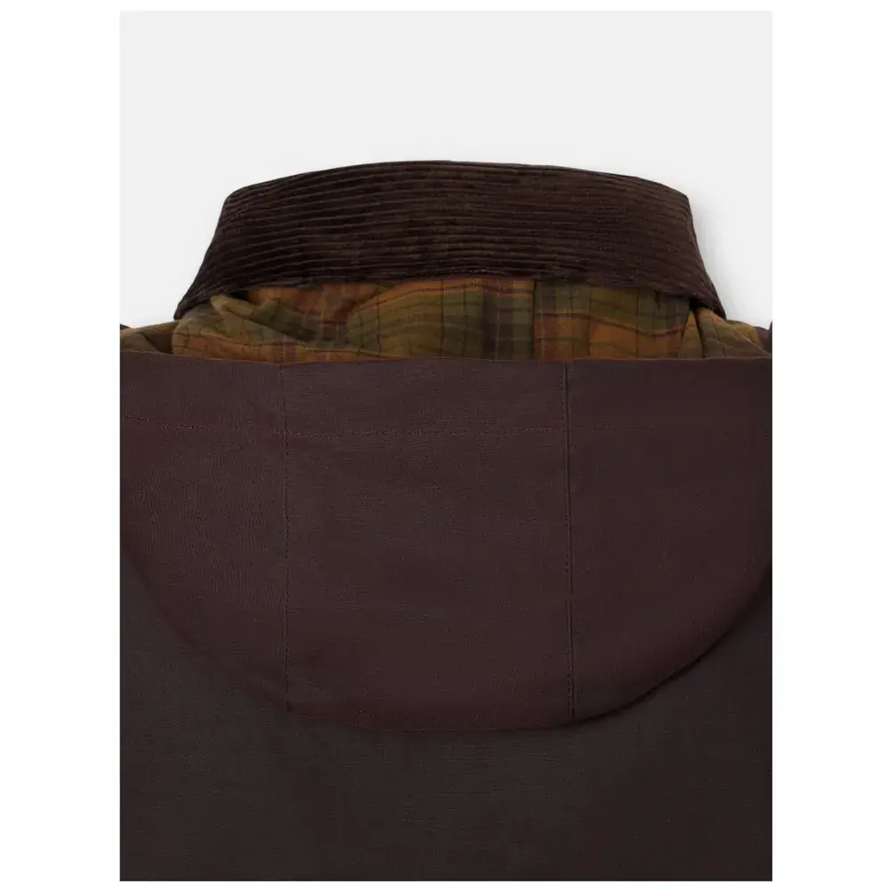 Классическое темно-коричневое пальто прямого кроя из 100% вощеного хлопка. Передние накладные карманы с клапанами и передние карманы-вставки, двусторонняя металлическая молния с металлическими кнопками в тон, классический вельветовый воротник.