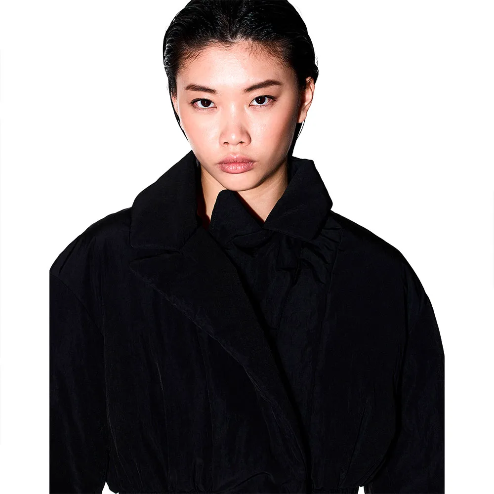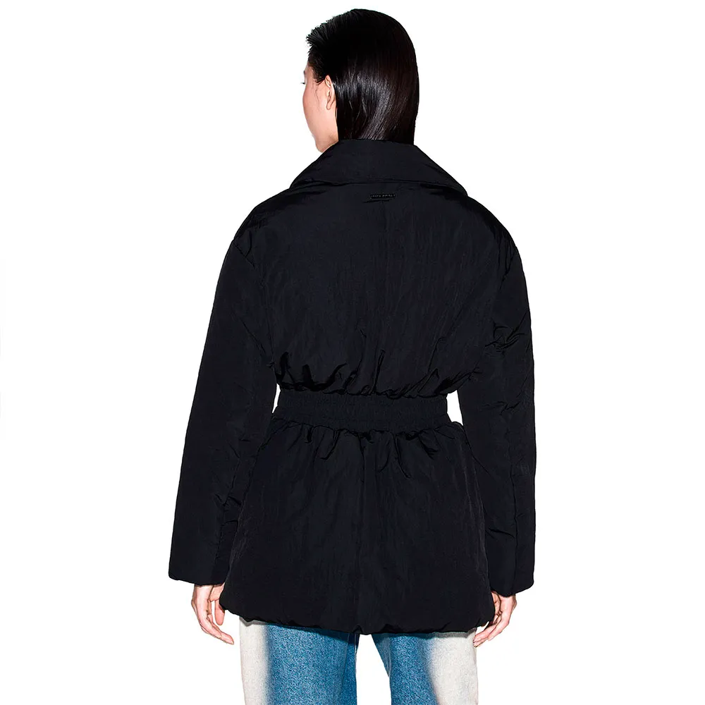 Короткий жакет на подкладке с отворотом-козырьком и эластичной талией.