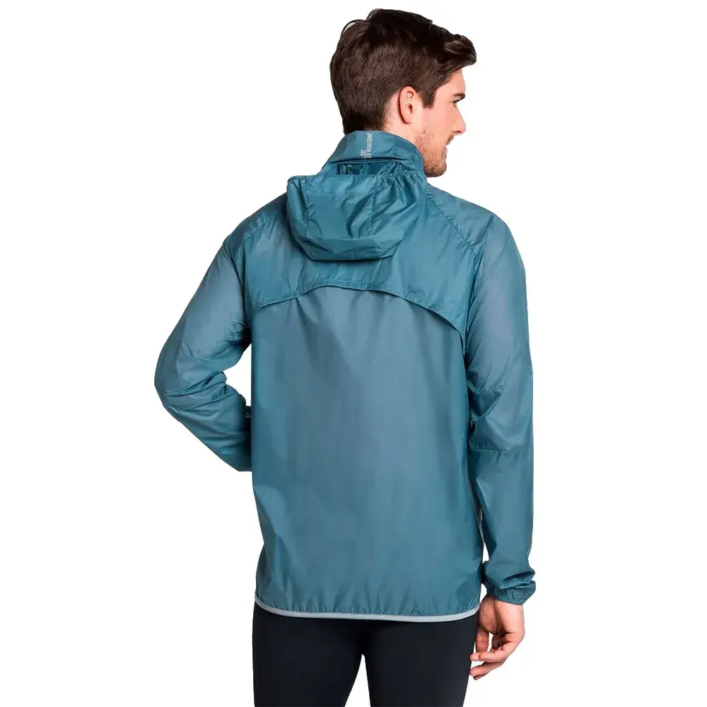 Благодаря спортивному крою с полной передней молнией и складным капюшоном, она идеально подходит для легких пробежек в сырую погоду.