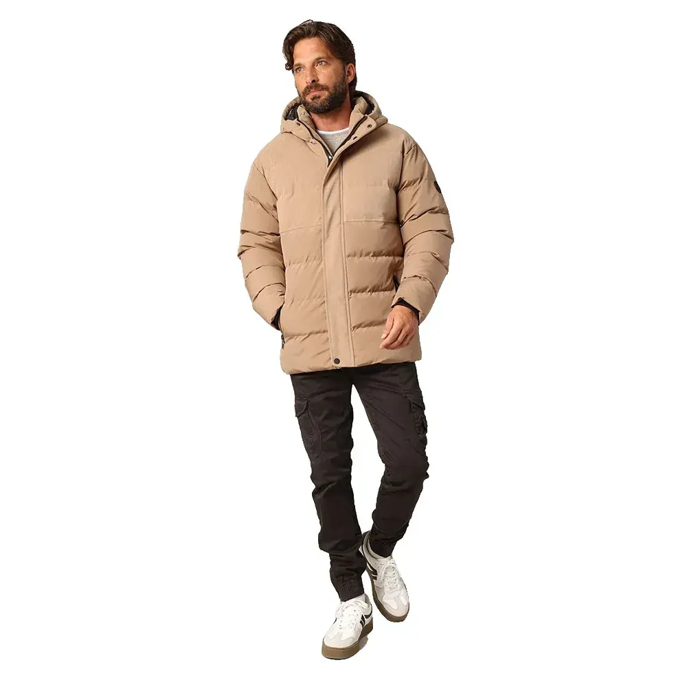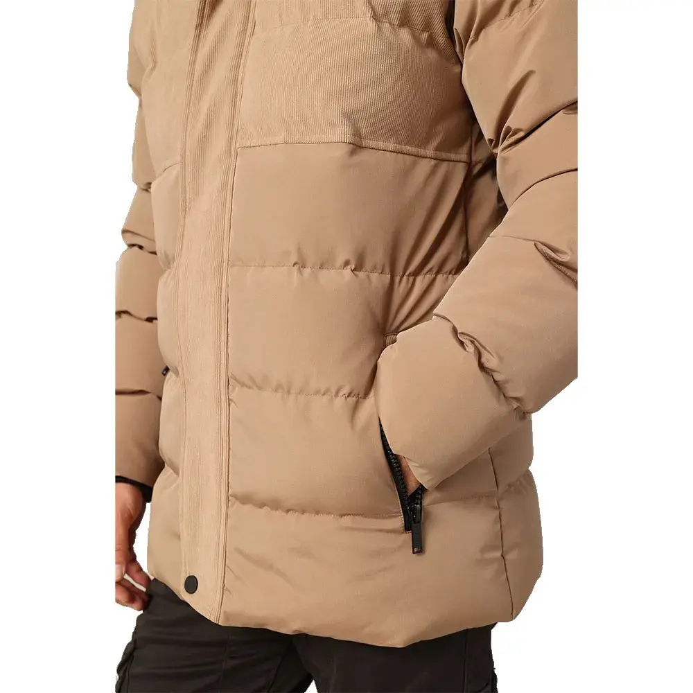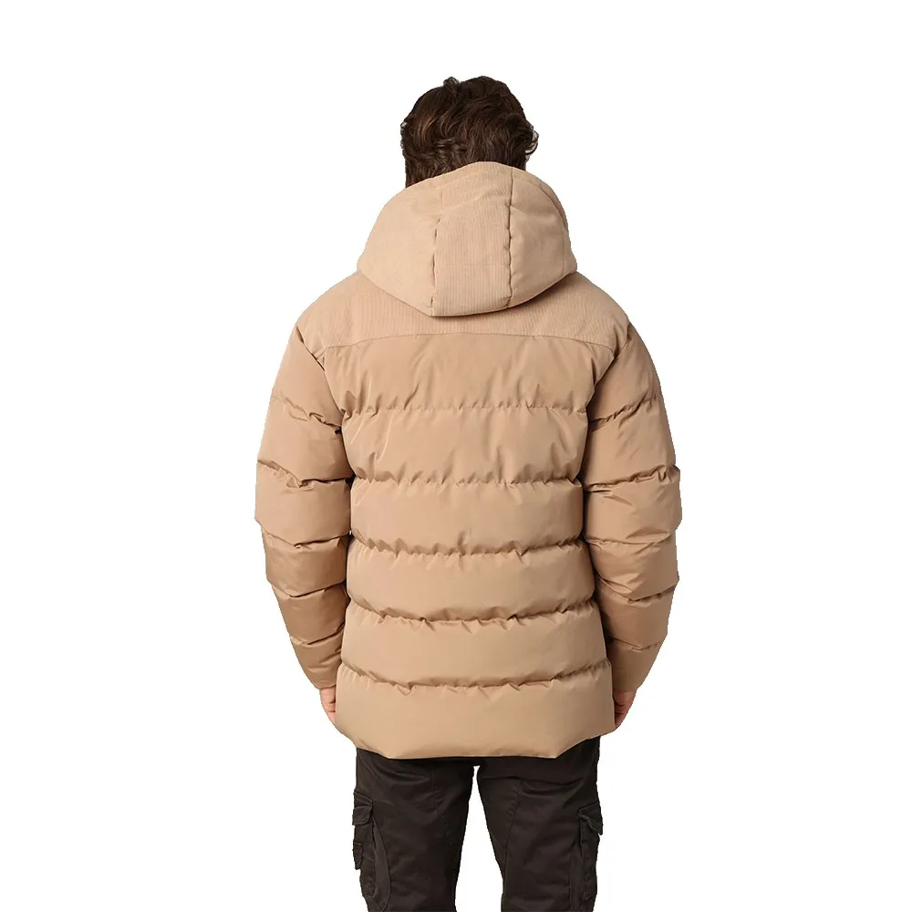 Мужская пуховая куртка Context в городском и функциональном стиле. Эта стеганая модель имеет удобный прямой крой со встроенным капюшоном, защитный воротник-стойку и застежку-молнию, скрытую под планкой с кнопками. На груди и капюшоне видны вельветовые вставки, добавляющие рельефности и контраста. Два кармана на молнии по бокам обеспечивают практичность и безопасность. Изготовленное из водоотталкивающего материала, это пальто идеально подходит для работы при низких температурах, сохраняя при этом современный вид.
