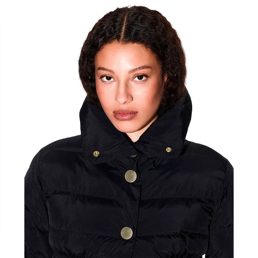 Мягкий блузон с высоким воротом, металлическая застежка на пуговицы и горизонтальное стеганое одеяло разных размеров.