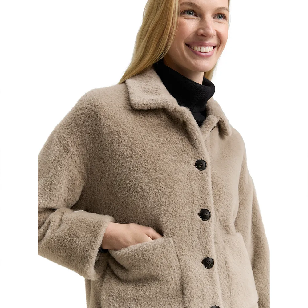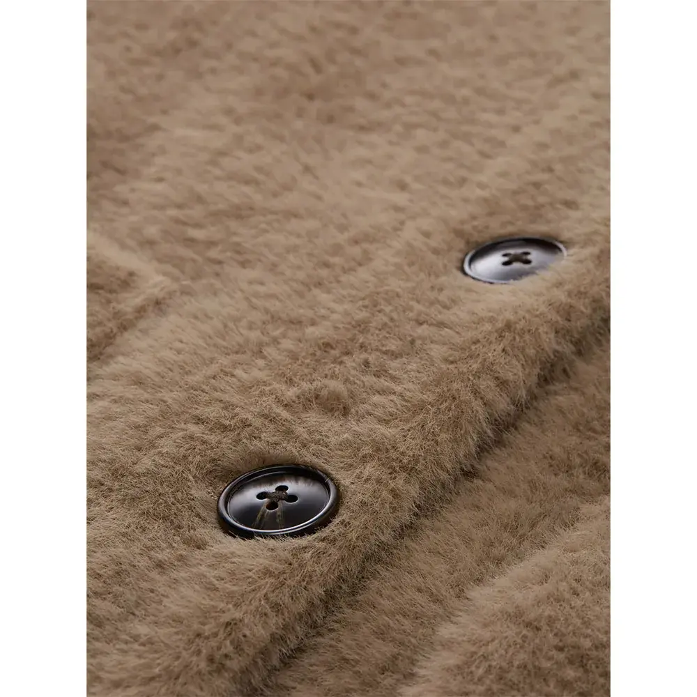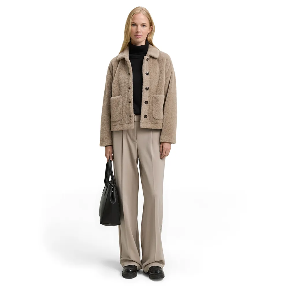 Мягкий жакет с воротником, планкой на пуговицах и накладными карманами спереди.